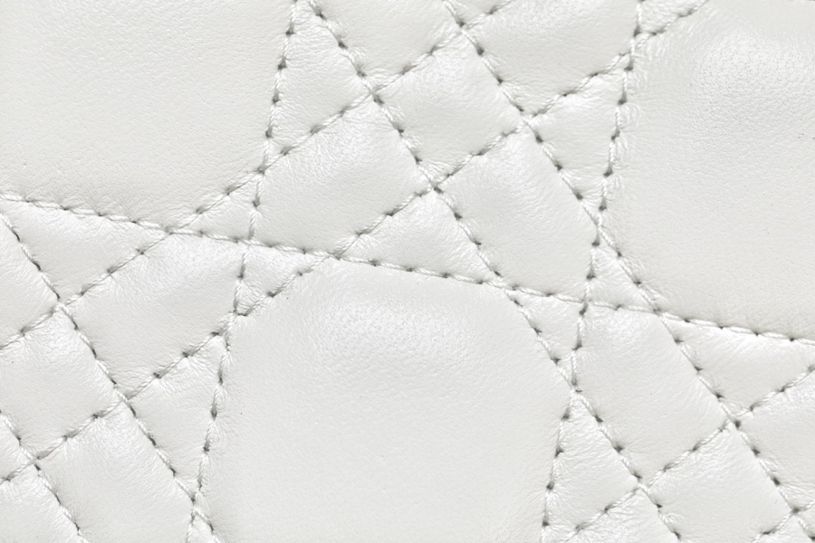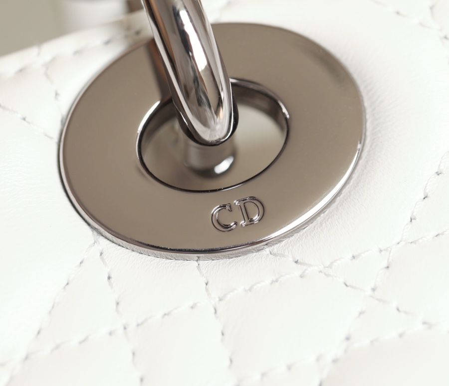 The handbag showcases the iconic Dior emblem. Combining exquisite elegance with a fashionable and modern style, it is a timeless classic piece. Carefully crafted from creamy white sheepskin leather, adorned with Cannage wicker pattern stitching, the superior craftsmanship is evident in every detail. The bag is embellished with a metal-coated “D.I.O.R.” charm, adding a touch of playfulness to its striking silhouette. The unique design features a wide shoulder strap that can be adorned with badges to showcase individuality. It can be carried by hand, worn over the shoulder, or crossbody.