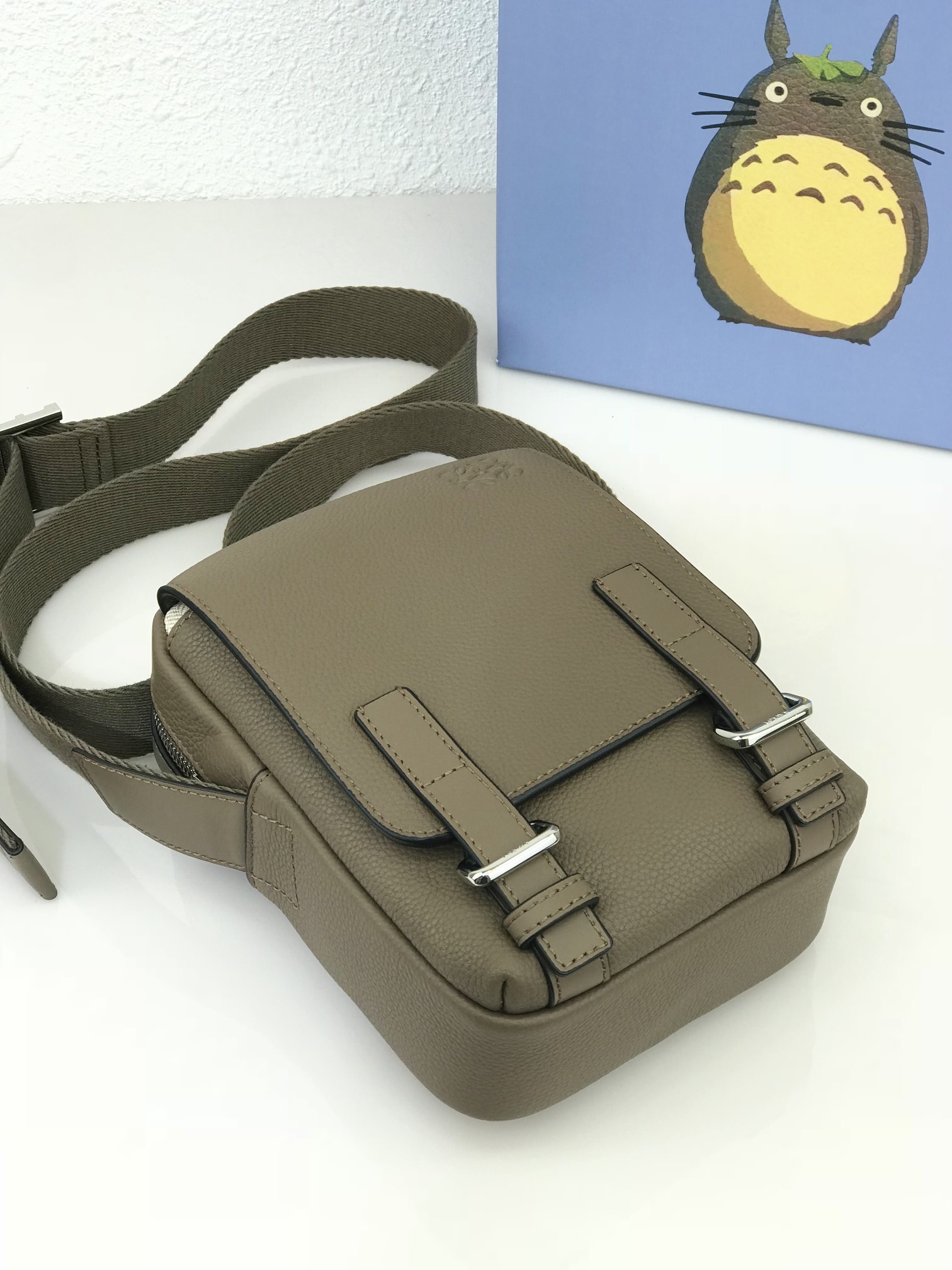 Introducing the Military Crossbody, a khaki green crossbody bag for men. It is crafted from grained small cowhide leather and features a zippered main compartment and a fold-over flap with a separate compartment underneath. It can be worn over the shoulder or across the body, with an adjustable shoulder strap. The bag is adorned with logo-engraved metal hardware and secured with a magnetic closure. It also comes with a box and can hold essentials like a phone and power bank.