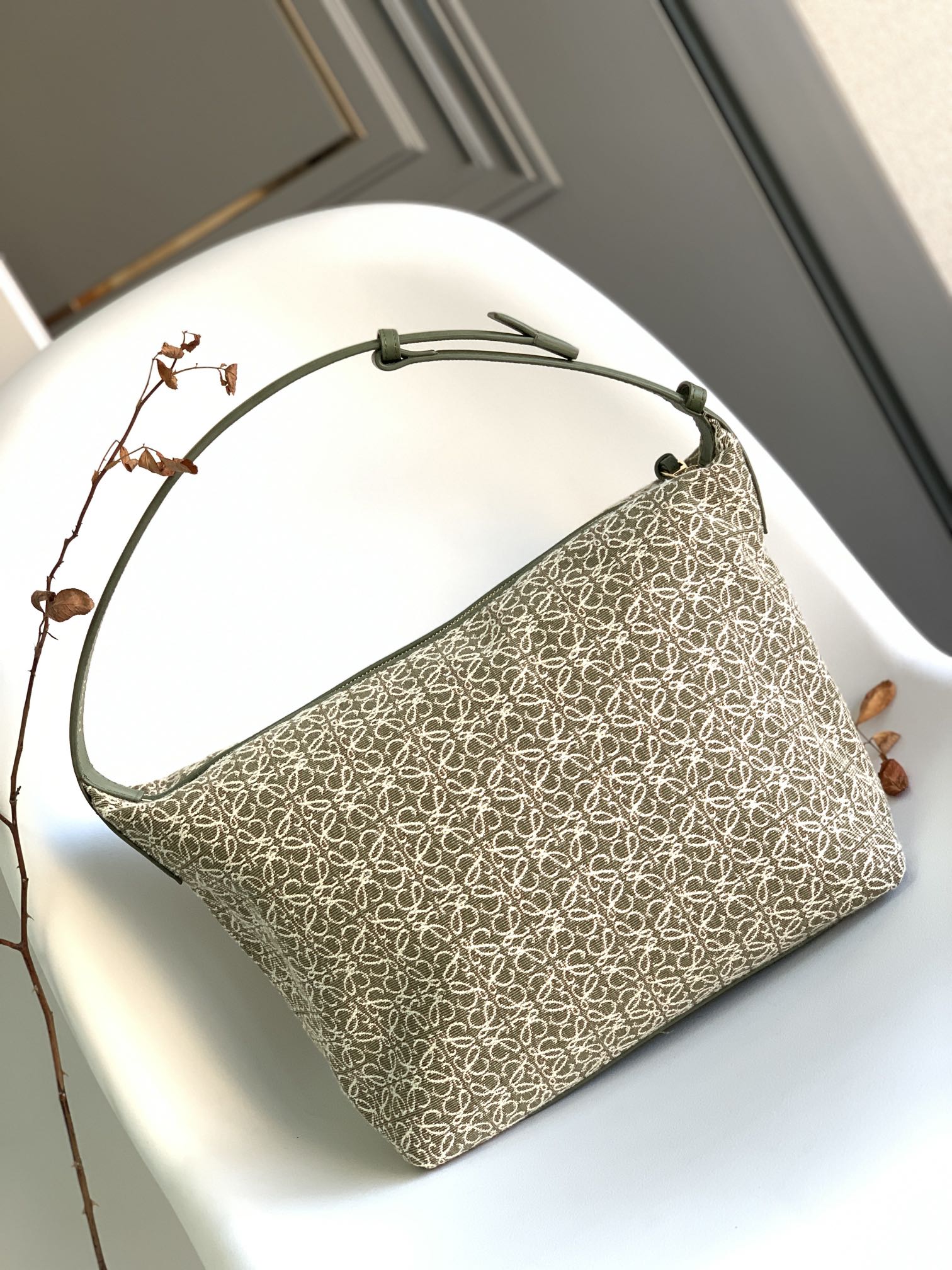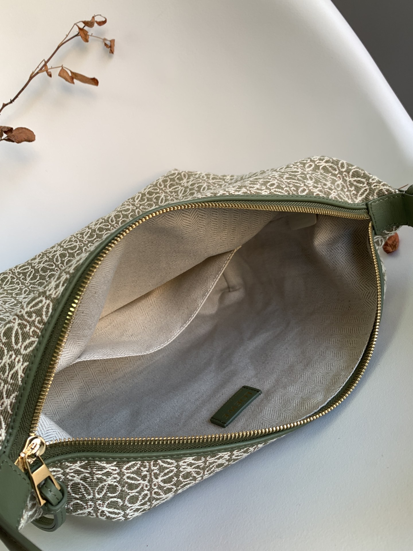Introducing the large Lunchbox bag, Cubi Anagram underarm bag. Made with imported cowhide and jacquard canvas, adorned with repeated Anagram pattern. Can be worn as a shoulder bag or carried by hand. Adjustable shoulder strap, zip closure, cowhide zipper pull, interior pocket, herringbone cotton canvas lining. [Sinister]