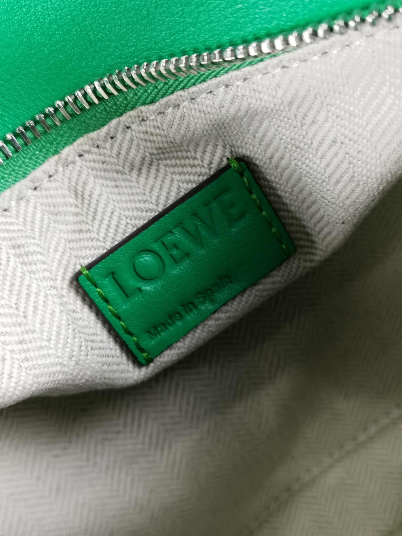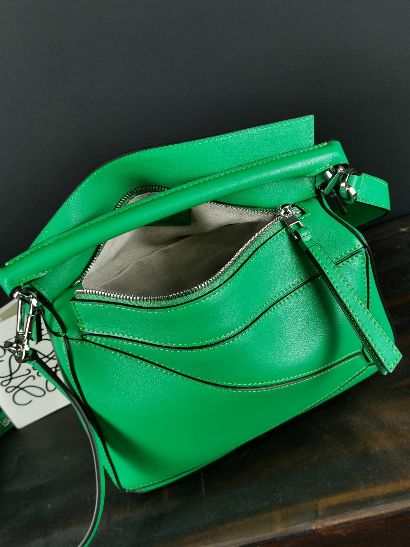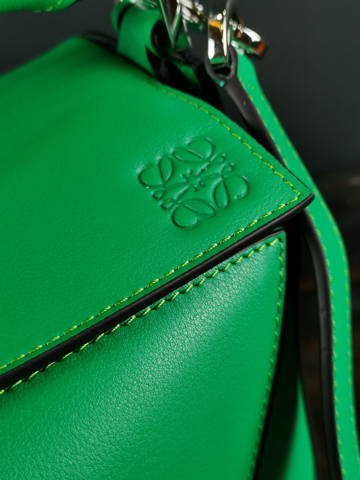 The Loewe Puzzle in its latest rendition features a small-sized slender shoulder strap, bottom without feet studs, and seamless construction. The interior is fully lined with leather, and it is made with imported Spanish calf leather, which is soft and has an incredibly smooth texture. The leather is precisely cut, allowing it to naturally fold, making it suitable for hand-carrying or crossbody wear (multiple ways to use). The long shoulder strap is detachable, and it features a textile lining.