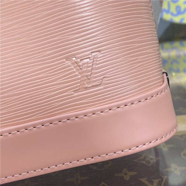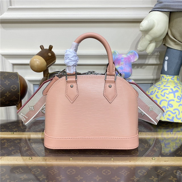 This charming Alma BB handbag crafted from grained Epi leather is offered for Spring in a powdery pastel hue. One of the Maison’s most recognizable shapes, the Alma traces its origins to the Art Deco period. This modern edition sports a wide jacquard strap woven with the “Louis Vuitton” signature, for a contemporary cross-body carry.
