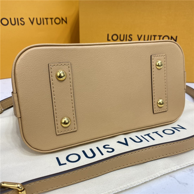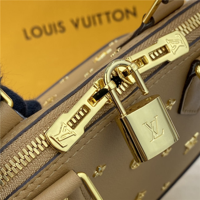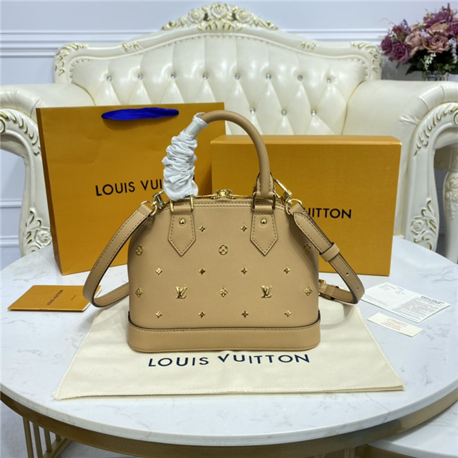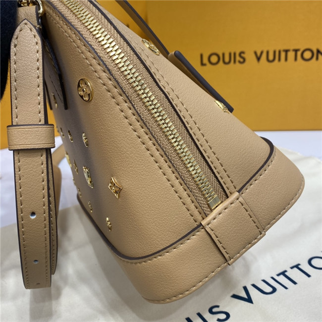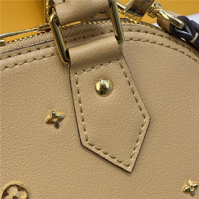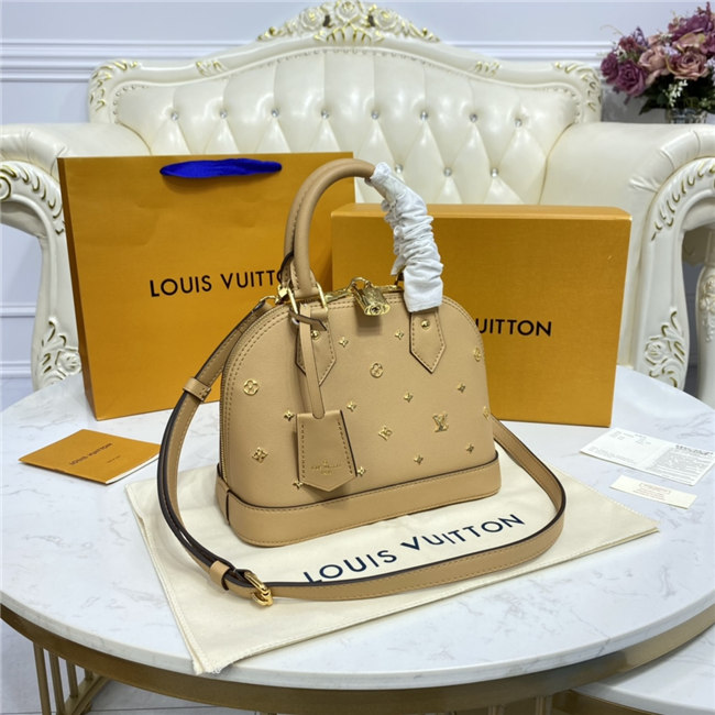Made from calfskin leather with a glamorous metallic Monogram pattern, this adorably sized Alma BB handbag is instantly recognizable. The iconic shape and signature House details – padlock, rolled leather handles, and key bell – make this small bag a classic. A detachable strap enables shoulder and cross-body wear.
