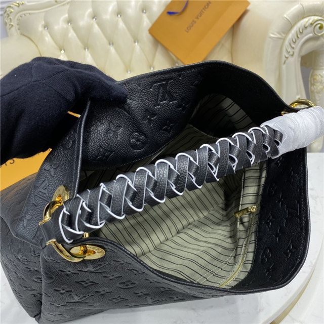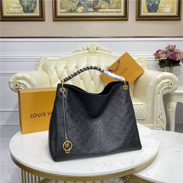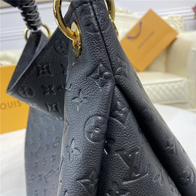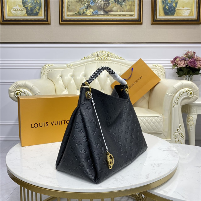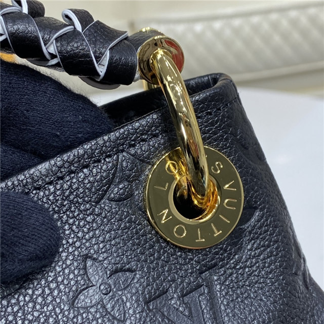 The Artsy MM handbag delights with its refined craftsmanship and functional features. Fashioned from supple Monogram Empreinte embossed leather, this quietly luxurious hobo features a handmade, cross-stitched handle that slips easily over the shoulder. Beautifully detailed with gleaming golden hardware (note the engraved eyelets, D-ring, and key holder), it opens to reveal a roomy, well-organized interior.