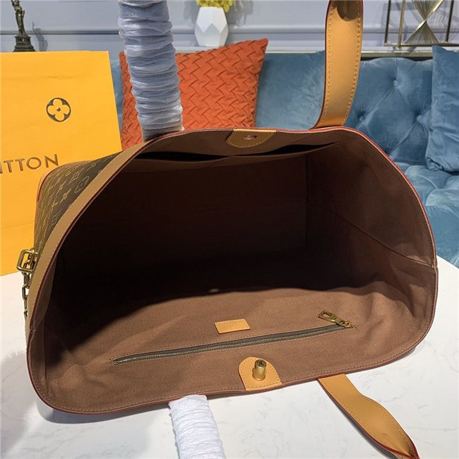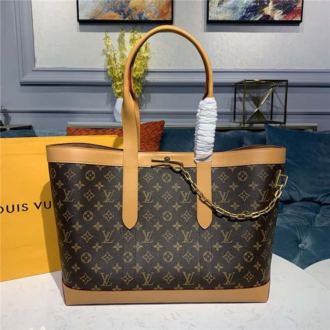 Large enough to fit a laptop, magazines, and a couple of books, the Cabas Voyage tote for men in iconic Monogram canvas and natural leather is accessorized with Virgil Abloh’s signature gold-tone chain and safety pin. Inside there’s a zipped flat pocket that can hold an iPad and a duo flat pocket for phones.