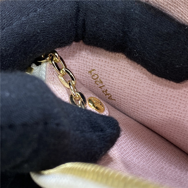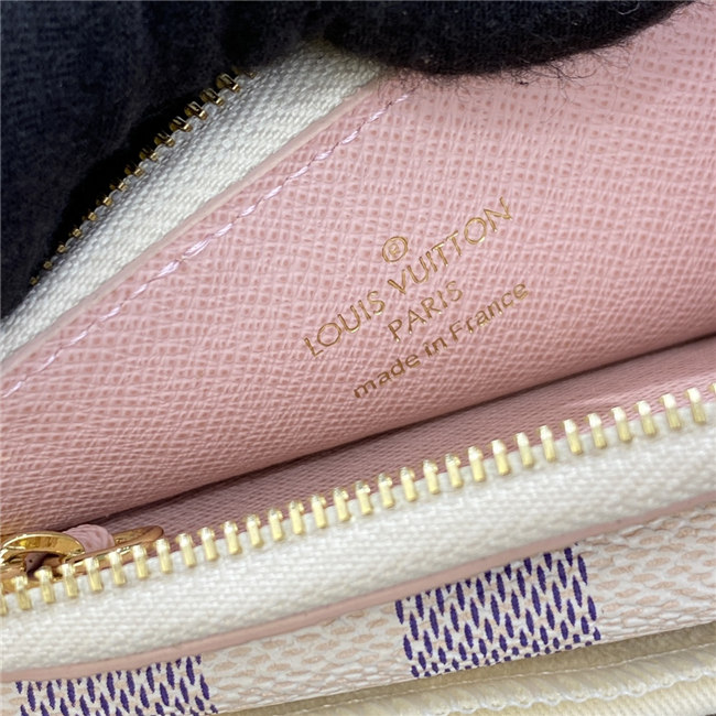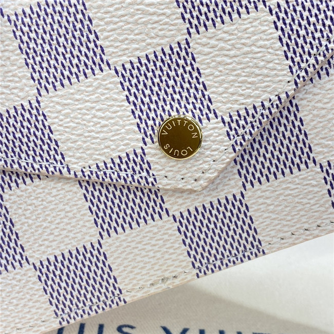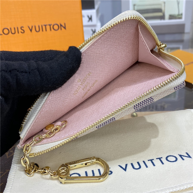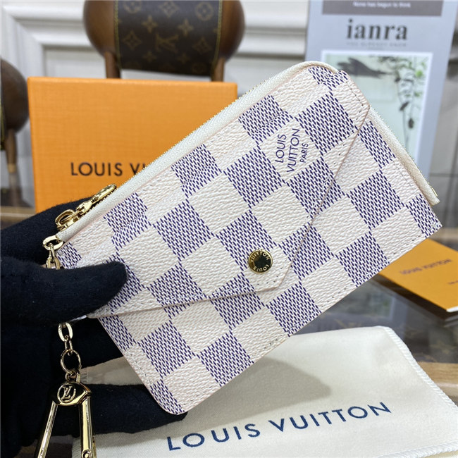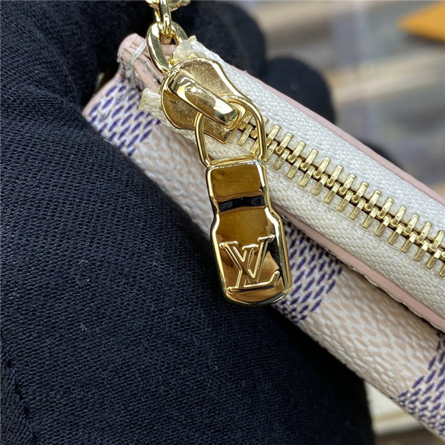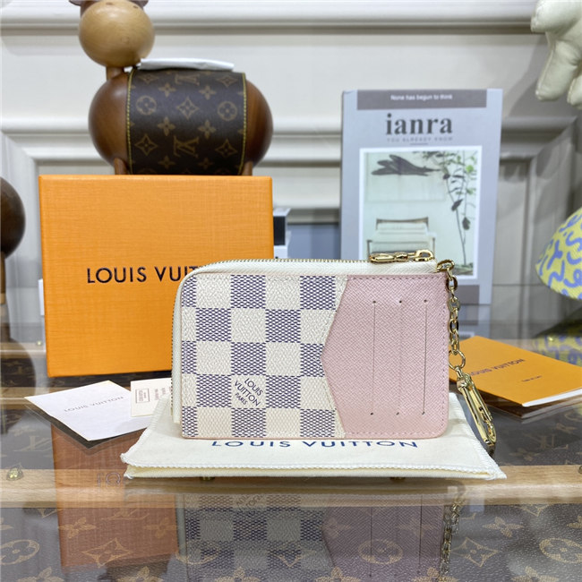 Crafted from Damier Azur canvas with colored leather trim, the Card Holder Recto Verso is an ingenious, multi-functional accessory, which can be hooked onto a bag or belt. Among its practical features are a flap pocket at the front, an in-between pocket for folded bills, a zipped compartment with a wide, L-shaped opening, and three card slots.