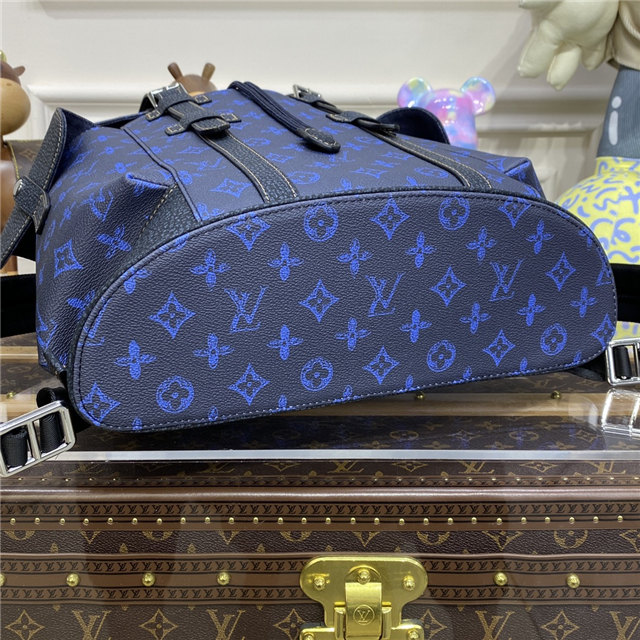 The Christopher MM backpack is made from coated canvas with a pattern of blue Monogram Flowers and LVs on a dark background. The trim in black leather, with contrasting stitching, and the LV initials leather patch emphasize the bag’s rugged design. Side pockets and an inside iPad pocket make this a functional and fashionable carry-all.
