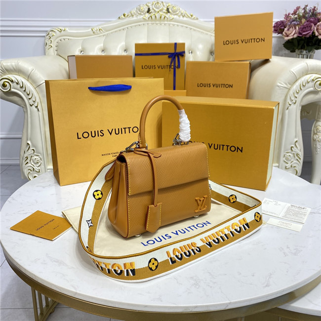 This exclusive Cluny Mini handbag features a reversible jacquard strap: one side displays the Louis Vuitton logo for a statement look; the other shows Monogram Flowers, for a subtle effect. Made from textured Epi leather, the bag also features an LV signature in smooth resin and a contrasting lining. The strap is removable for a more dressed-up allure.