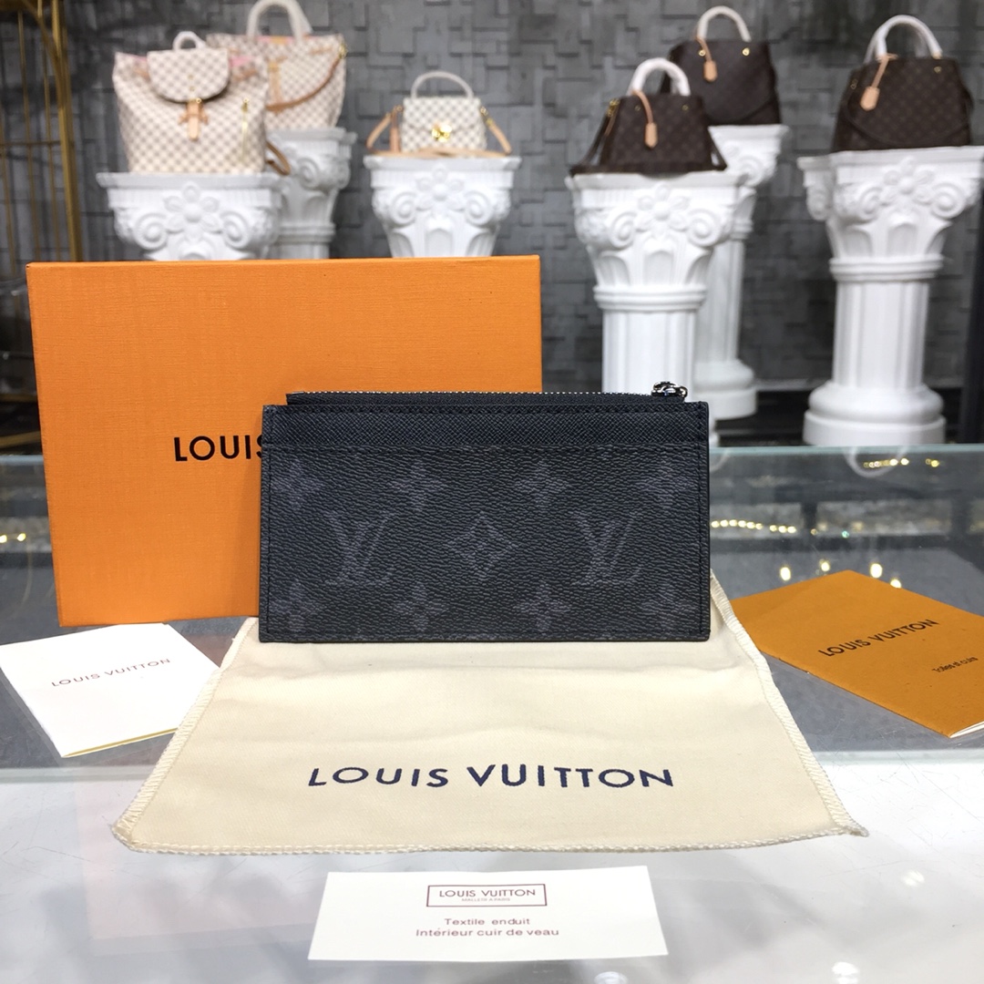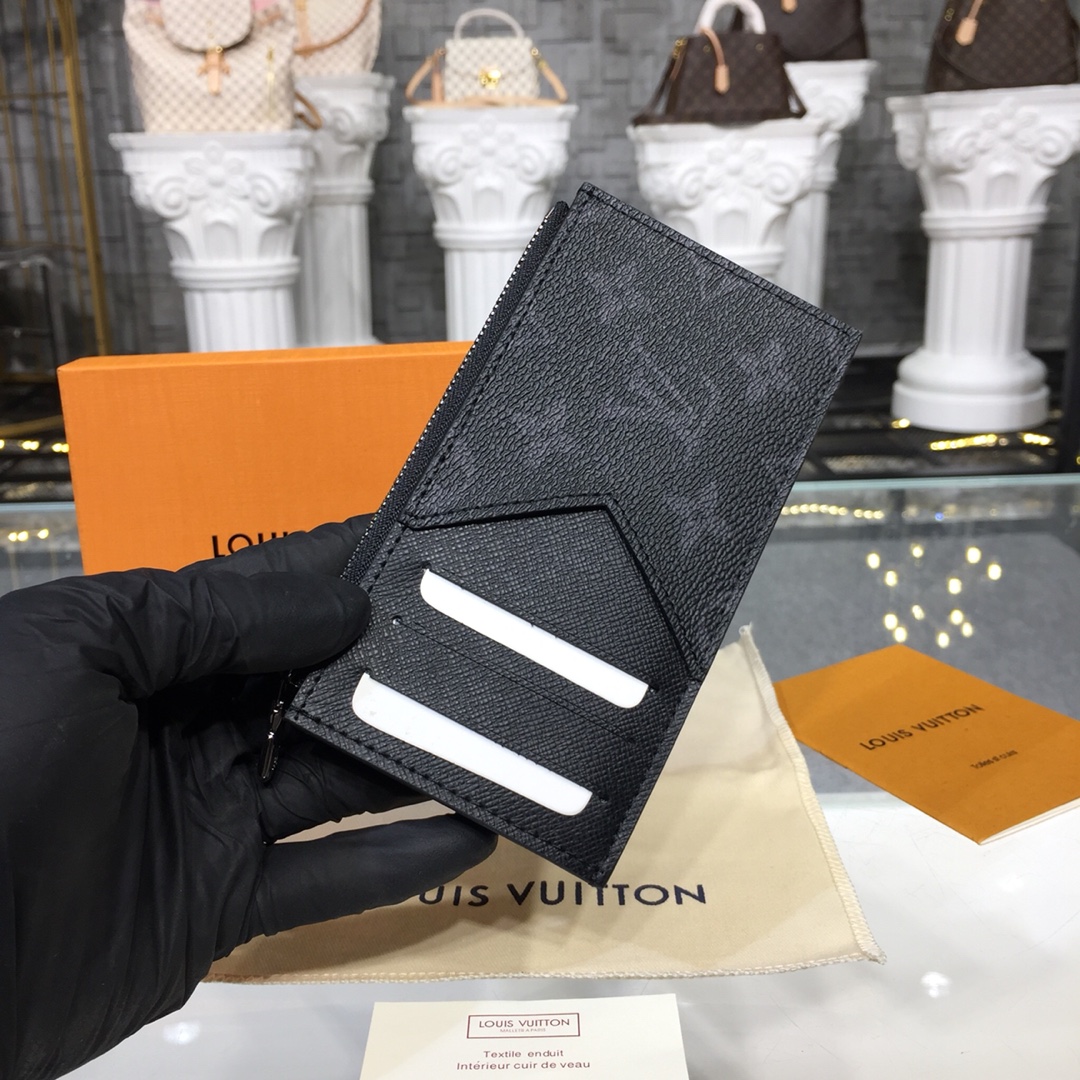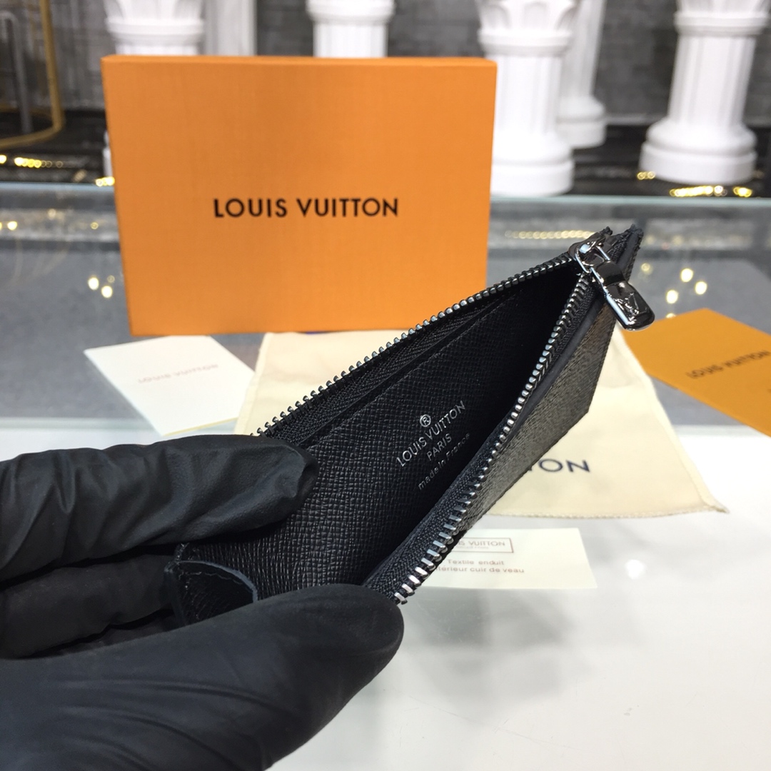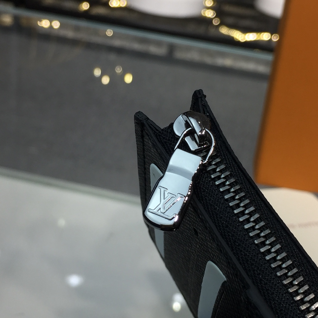 The Coin Card Holder in Damier Graphite canvas is the ideal solution to keep payment essentials in one safe place. Its neat, slim-line design features credit card slots, a zipped coin pocket and a compartment for banknotes.The black leather lining coordinates stylishly with the black and gray canvas.