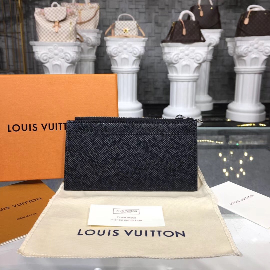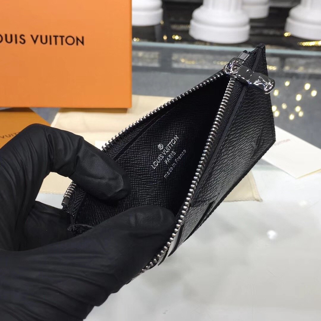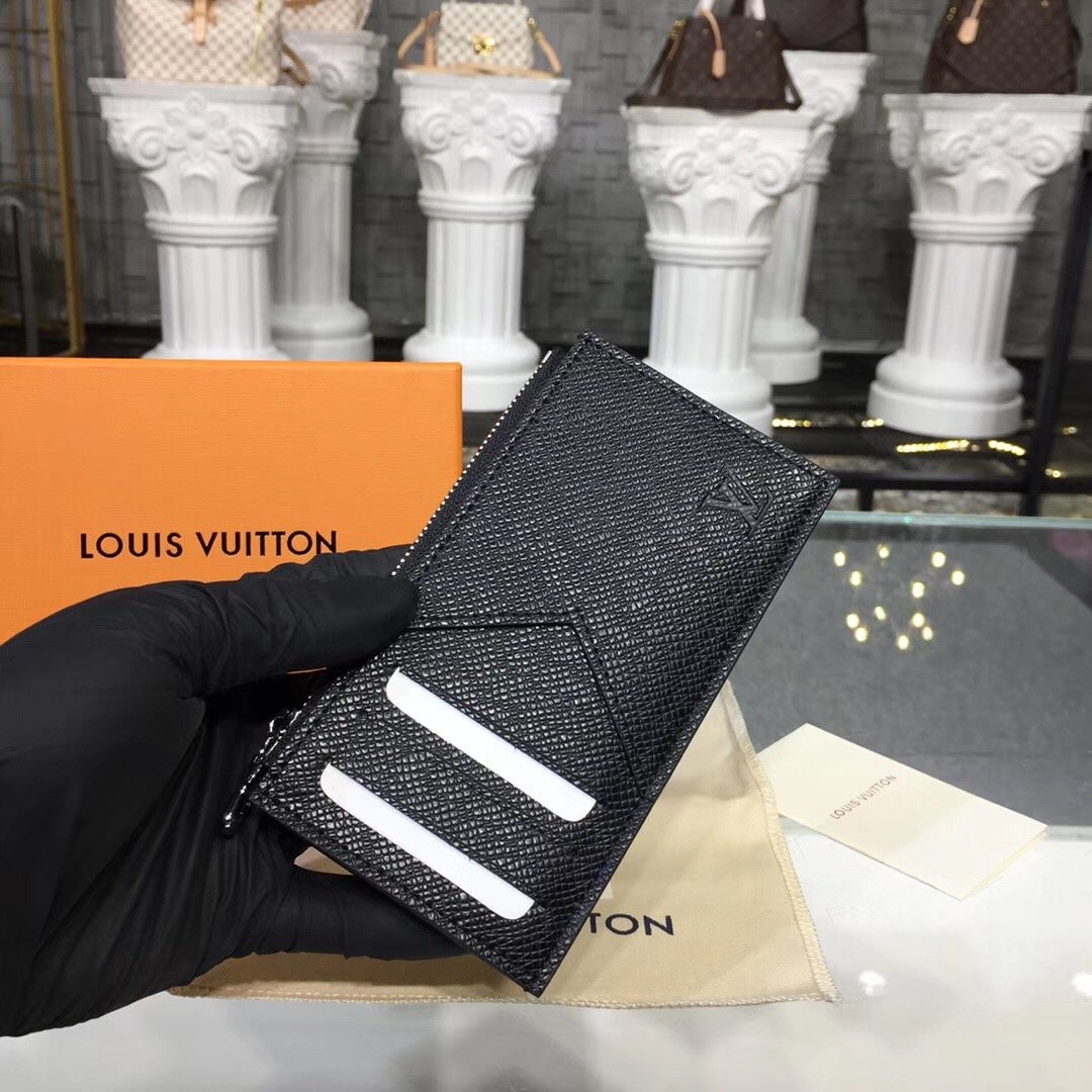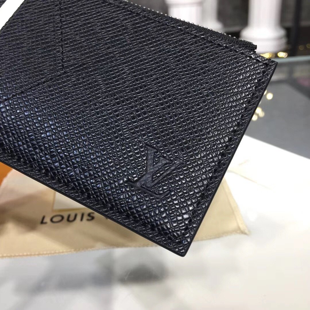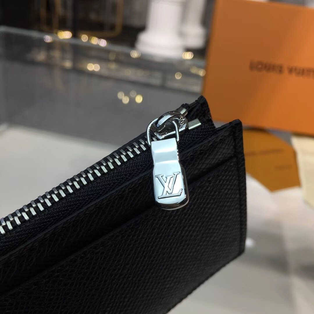 Crafted from Louis Vuitton’s signature black Taiga leather, the Coin Card Holder is a neat, slim design which keeps all payment essentials in one secure place. It includes several credit card slots and a compartment for banknotes, in addition to a zipped pocket for coins with a silver-tone zip pull.