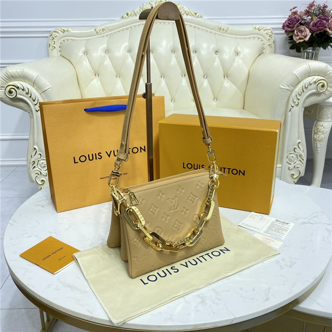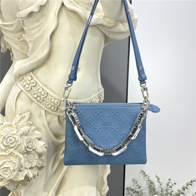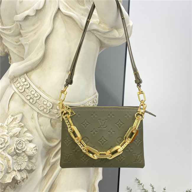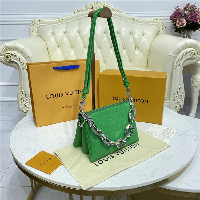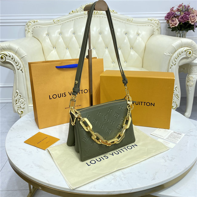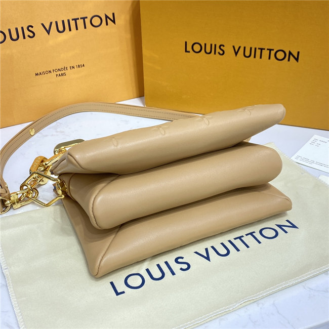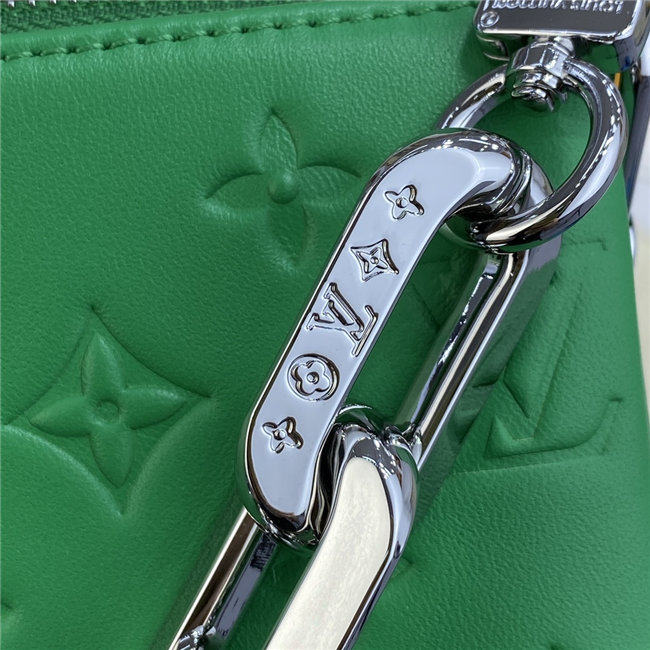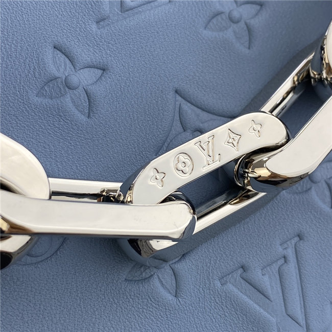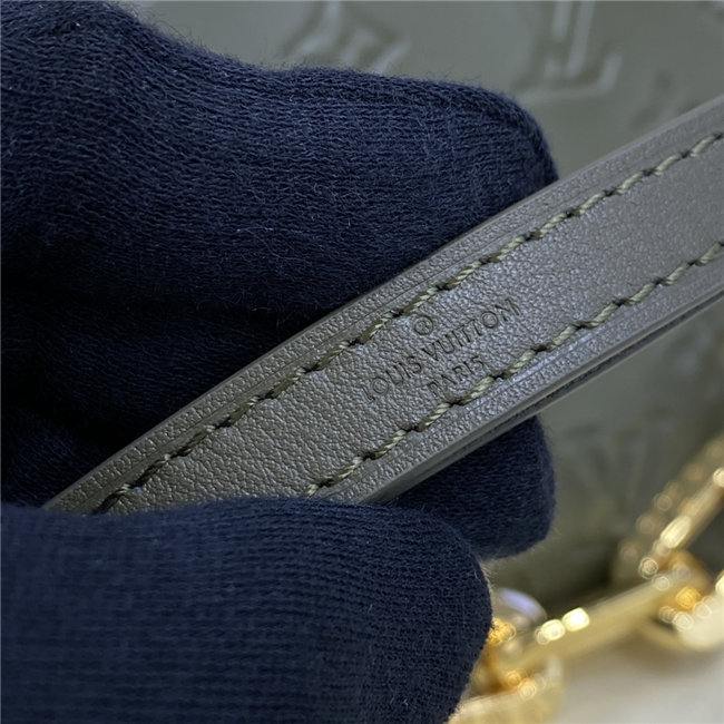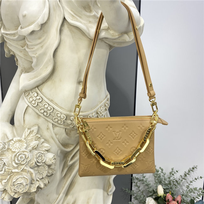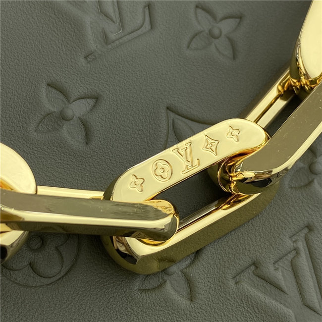 The super soft and cushiony Coussin BB is an adorably compact handbag, fashioned from puffy lambskin embossed with the Monogram pattern. A chunky gold-color chain and a thin leather strap, both removable, enable different attitudes and carry options. Two inside compartments add practicality, making this an ideal day-to-evening accessory.