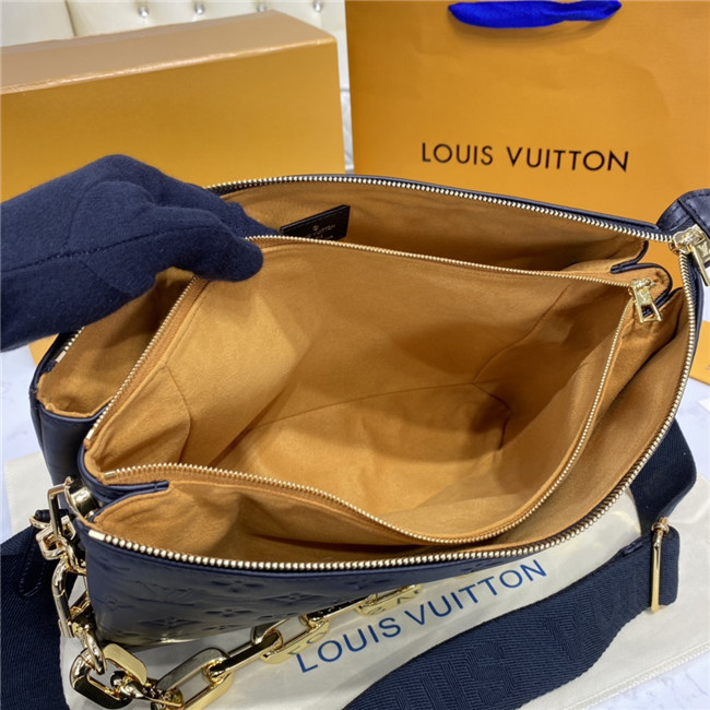 The most eye-catching bag of the Spring-Summer 2021 collection, the Coussin MM handbag is fashioned from puffy lambskin, embossed with a Monogram pattern. Voluminous, soft, and supple, the bag almost feels like a pillow. An adjustable leather strap allows shoulder and a cross-body carry, while the new Edge Chain, enables under-arm and baguette carry.