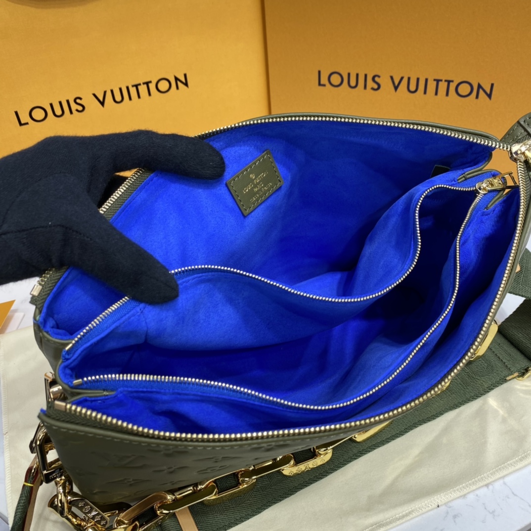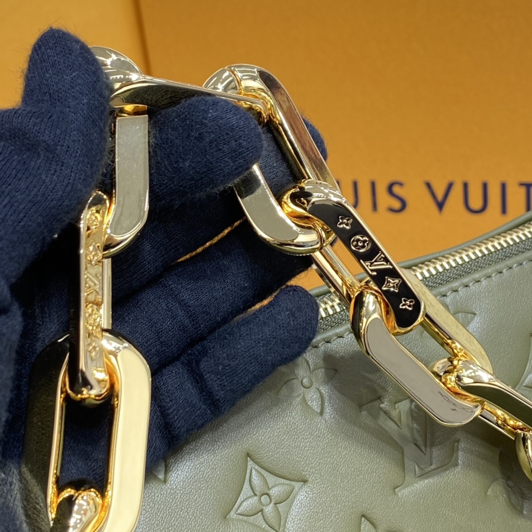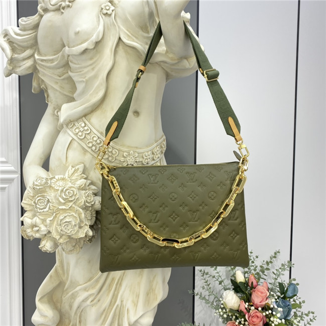 The most eye-catching bag of the Spring-Summer 2021 collection, the Coussin MM handbag is fashioned from puffy lambskin, embossed with a Monogram pattern. Voluminous, soft, and supple, the bag almost feels like a pillow. An adjustable leather strap allows shoulder and a cross-body carry, while the new Edge Chain, enables under-arm and baguette carry.