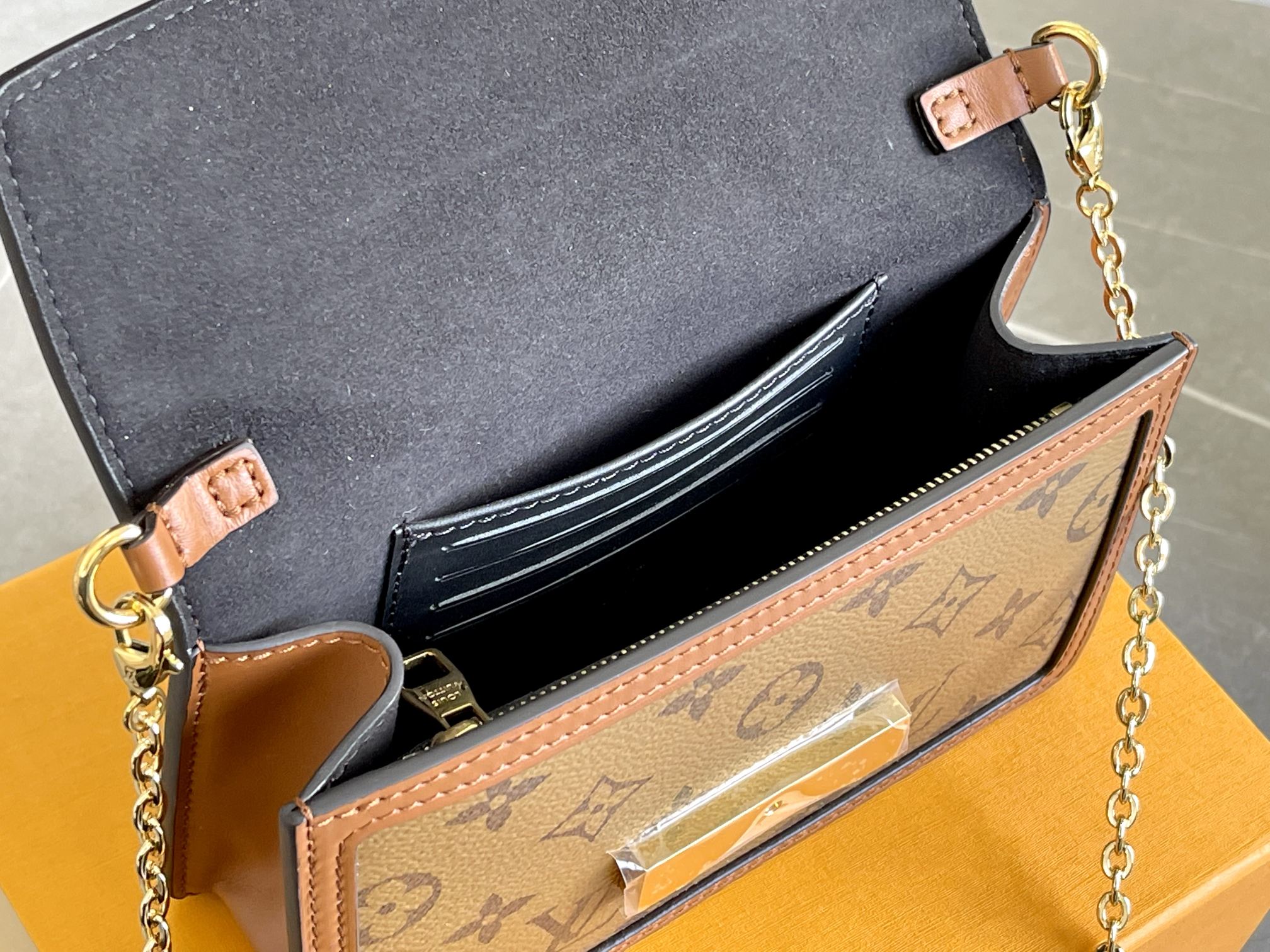Full steel replica! The new addition to the classic Dauphine handbag series: the Early Spring Collection, designed by Women’s Artistic Director Nicolas Ghesquière. It combines Monogram canvas with Monogram Reverse canvas, featuring an adjustable shoulder strap and magnetic lock closure, showcasing a modern style while staying true to the brand’s heritage and exuding a fashionable flair. An ideal choice for Monogram canvas enthusiasts. With the removable decorative strap, it can instantly transform into a clutch.