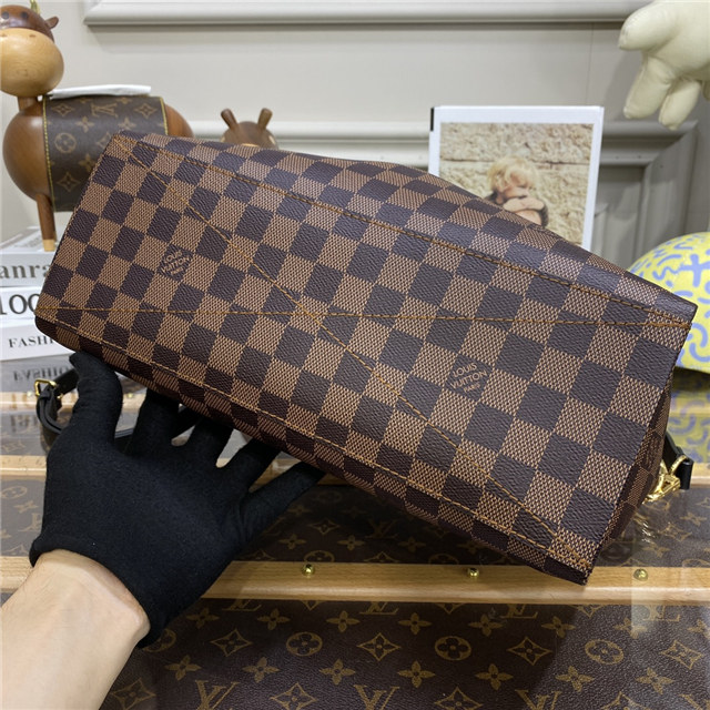 Fashioned from Damier Ebène canvas and lined in black fabric, the Odeon Tote MM handbag is for those looking for a spacious and easy-to-wear carryall. The gold-color side rings and eyelets, as well as the metallic LV signature on the leather luggage tag, make this bag instantly recognizable.