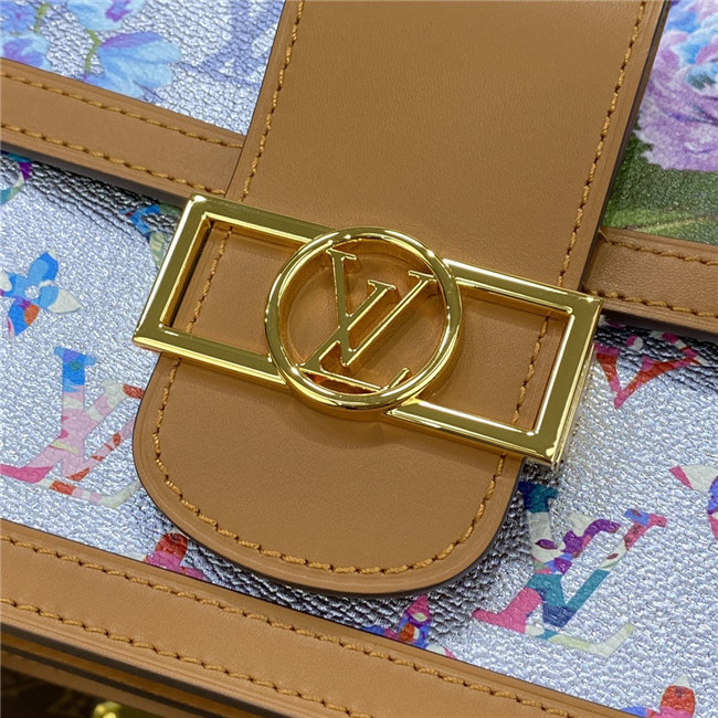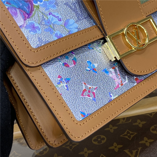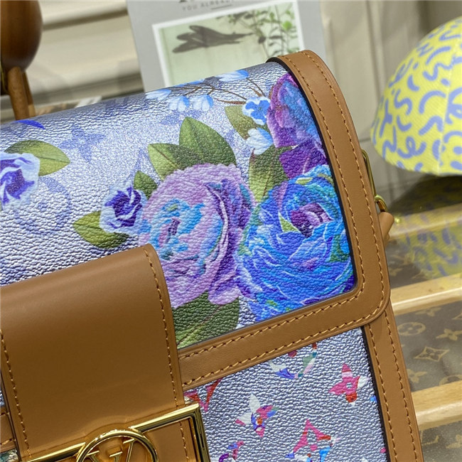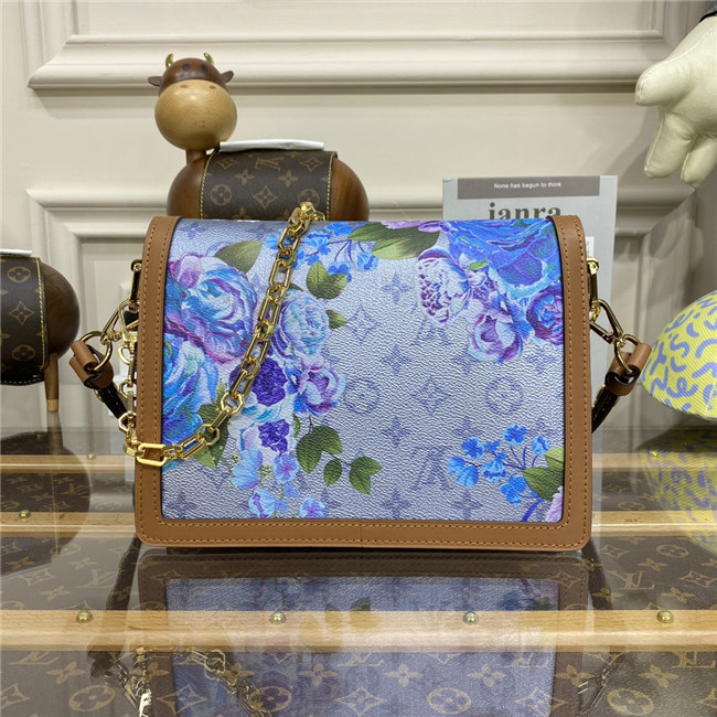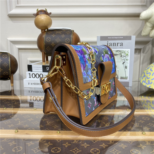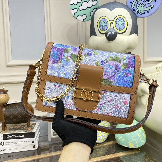 Nicolas Ghesquière’s buttercup pattern from the Fall-Winter 2022 show brings a bold feel to this Dauphine MM handbag in metallic-blue canvas with its gold-color LV Circle lock. The inside is composed of two compartments separated by an inside zipped pocket. The removable shoulder strap and detachable chain give a myriad of carry options.
