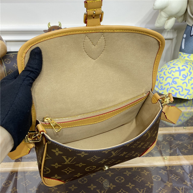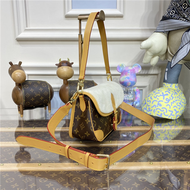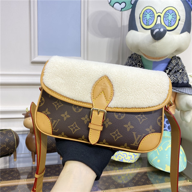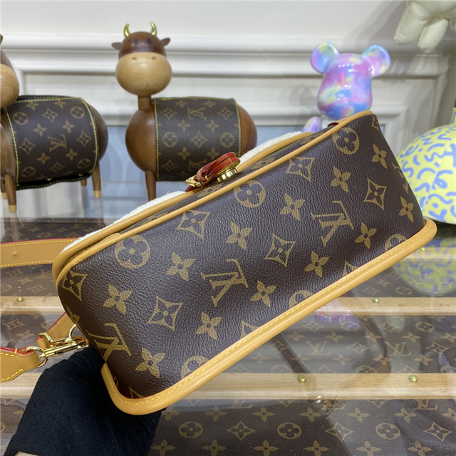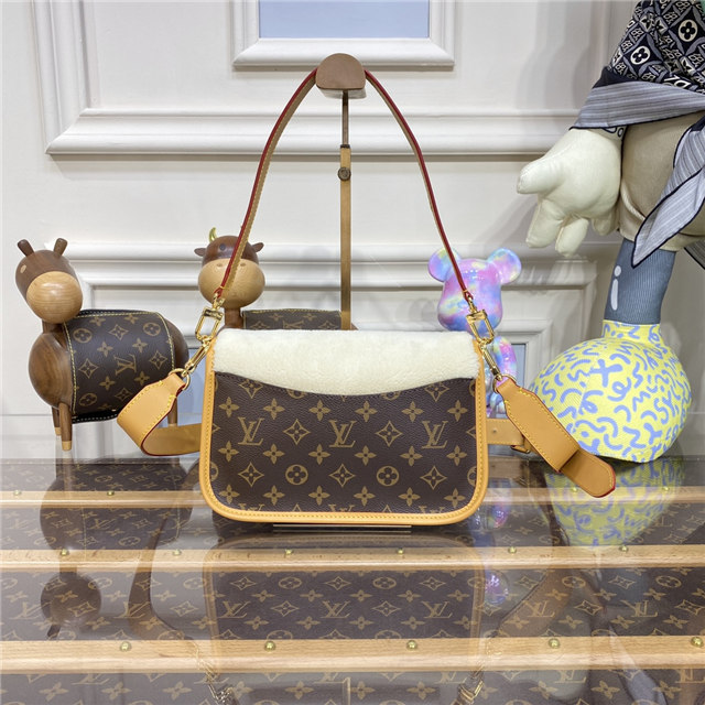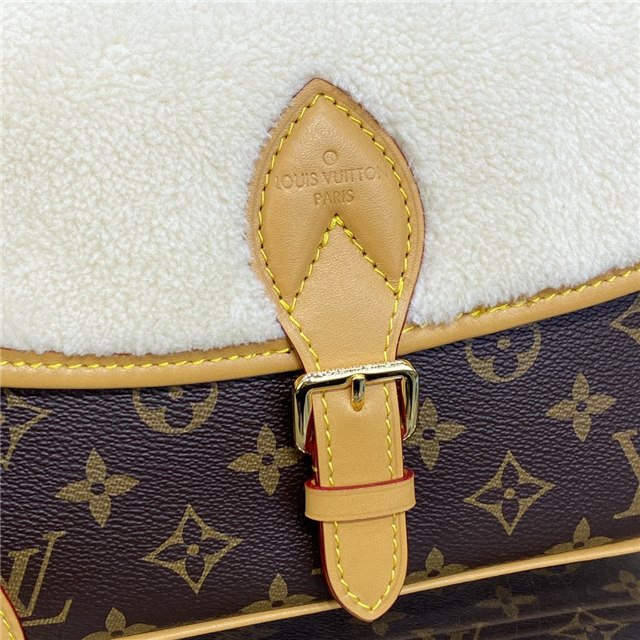 Soft, cream-hued shearling combines with iconic Monogram canvas in the Diane handbag, new for Winter 2022. Part of the Cozygram capsule collection, this covetable model is detailed with aged natural cowhide trim and gleaming gold-finish hardware. The detachable top handle and long leather strap offer a range of styling and carry options.