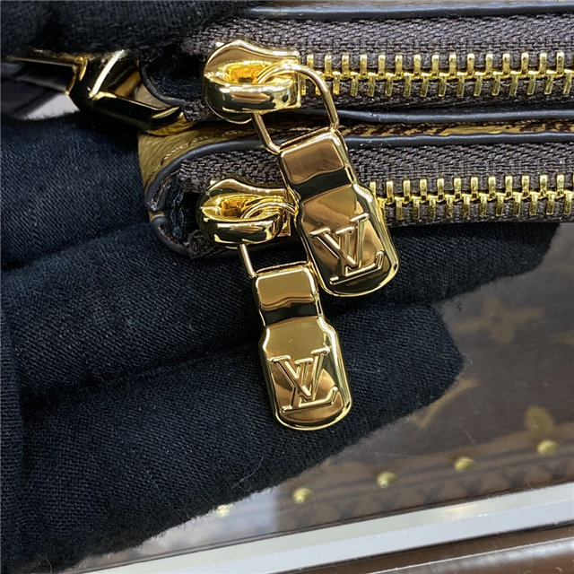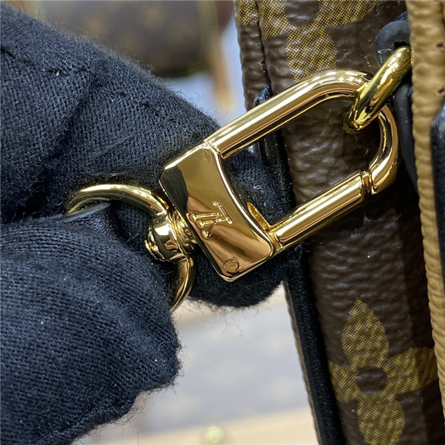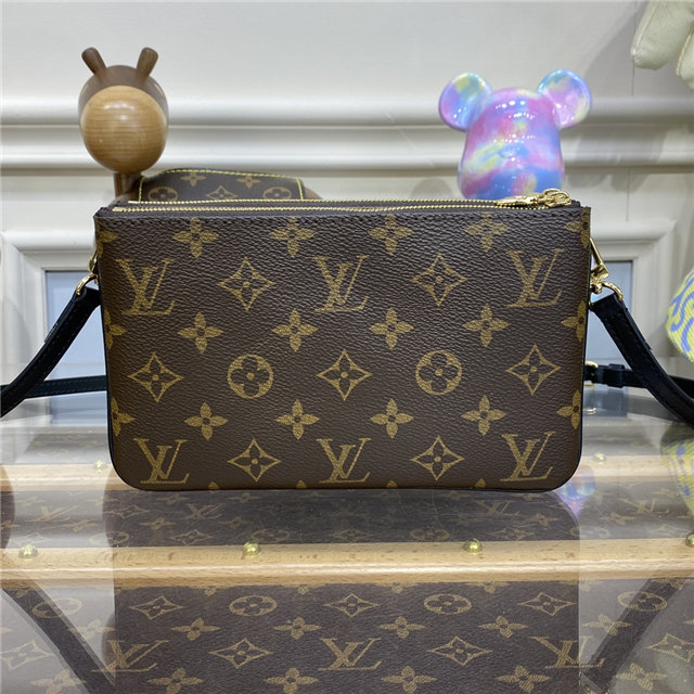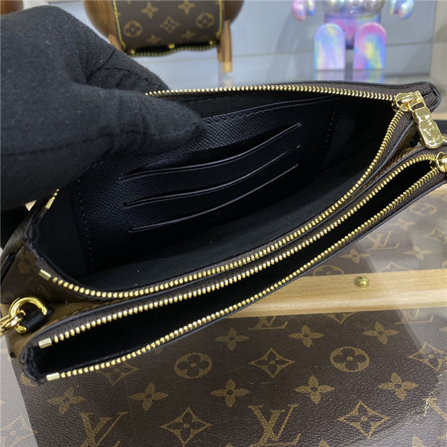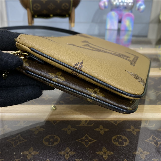Timeless Monogram and on-trend Monogram Giant Reverse canvas combine on the Double Zip Pochette, which comes with a removable, adjustable leather strap for multiple carry options. This versatile pouch features two zipped pockets to organize everyday essentials, one of which contains three card slots. The middle space offers easy access to items like tickets.