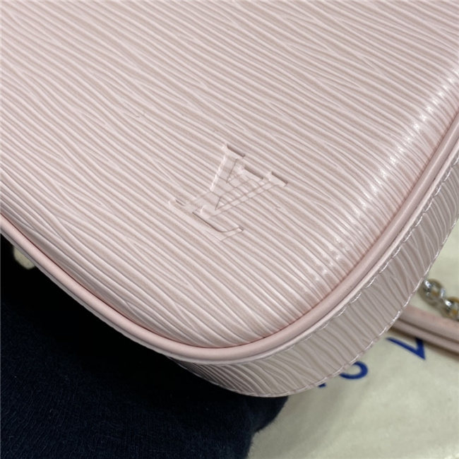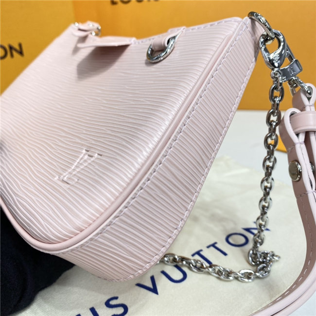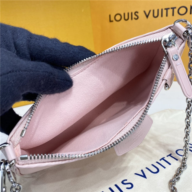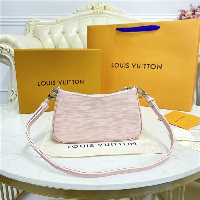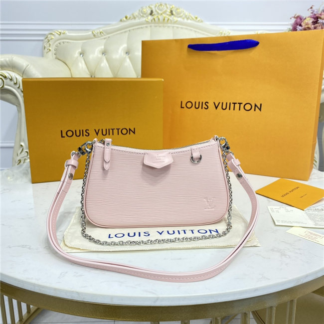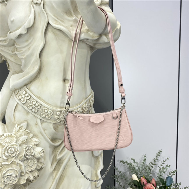 The Easy Pouch on Strap is a sleek design in grained Epi leather, discreetly embossed with the LV Initials. Large enough to hold everyday essentials, this on-trend model is notable for its versatility, featuring a removable chain and a removable, adjustable leather strap for shoulder or cross-body carry. The D-ring on the outside can be used to attach a charm.