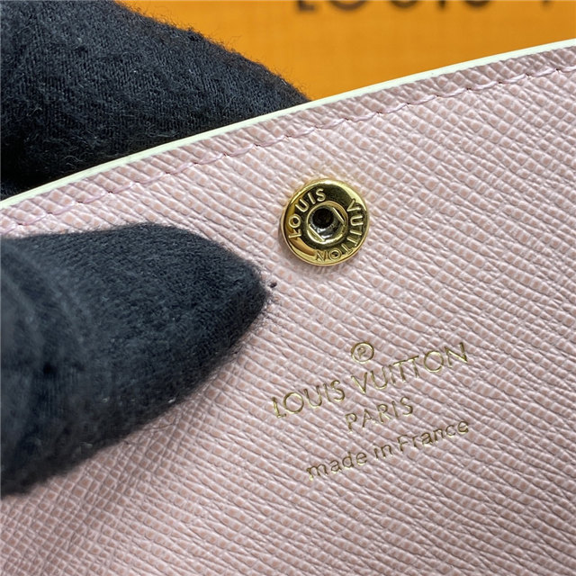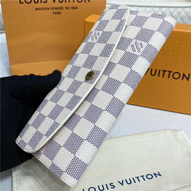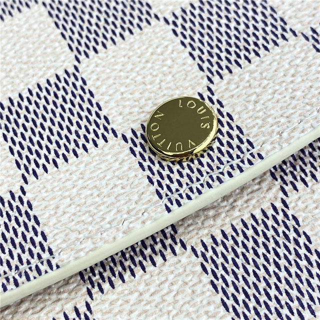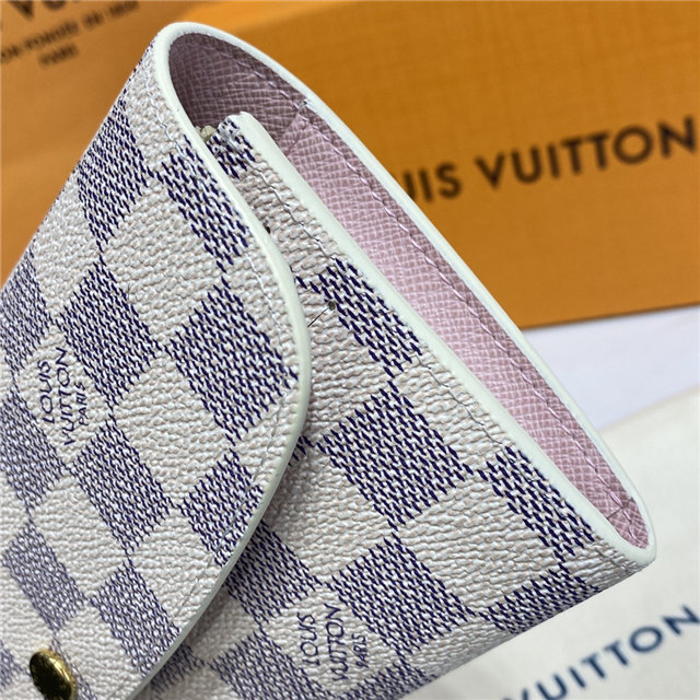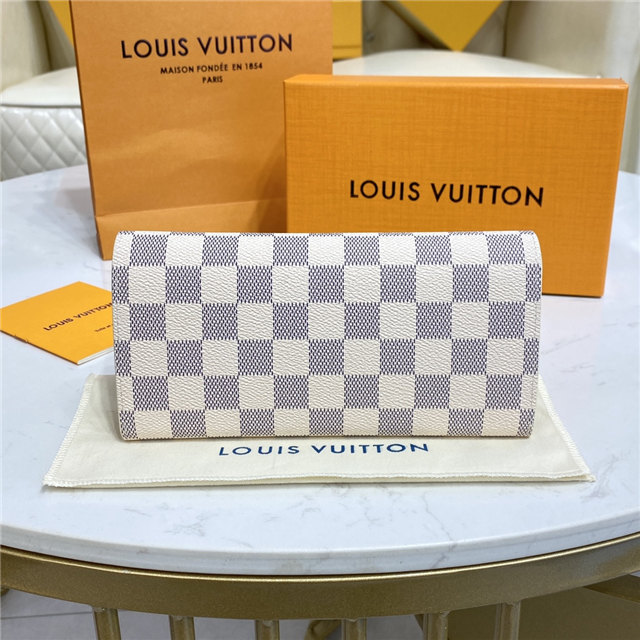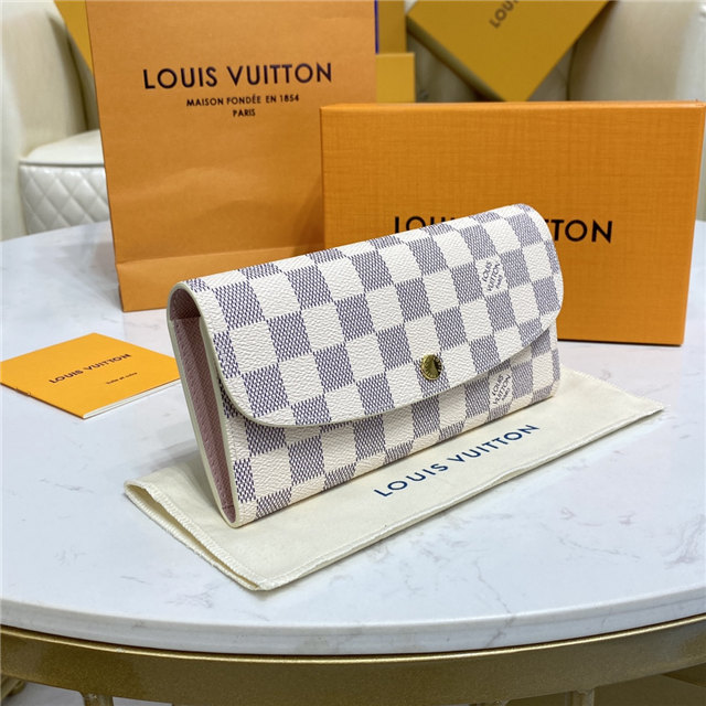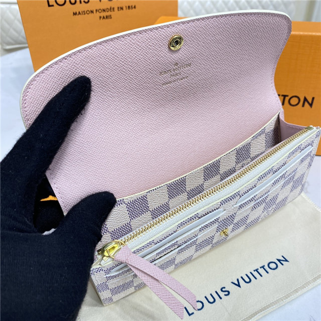 The Emilie wallet in Damier Azur canvas is a simple yet elegant design lined with grained cowhide leather. Its envelope-style flap opens to reveal a spacious interior compartment, zipped coin pocket and four card slots. With its slim-line format, the Emilie fits into any city bag, and can also double as a clutch.