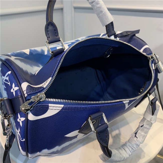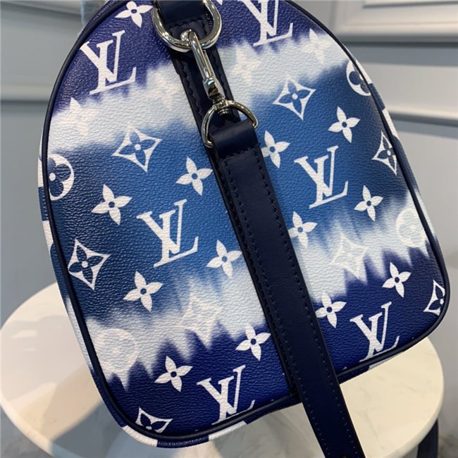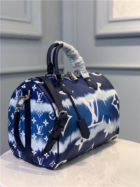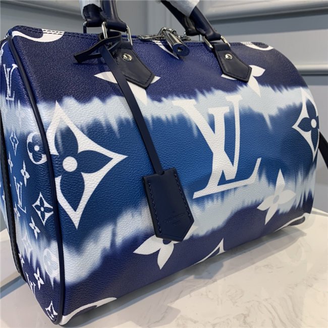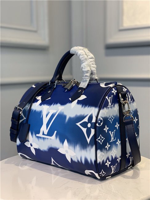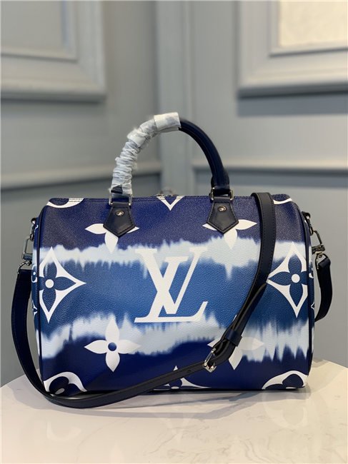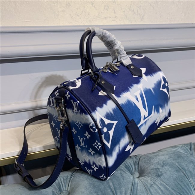 Tie-Dye Monogram canvas brings a beachy feel to the Speedy Bandoulière 30, a classic Louis Vuitton city bag relooked for the LV Escale Collection. The rolled-leather handles and distinctive shape make this bag immediately recognizable while the removable strap offers the option of comfortable shoulder carry. It’s signed with the iconic engraved padlock.