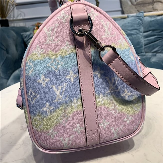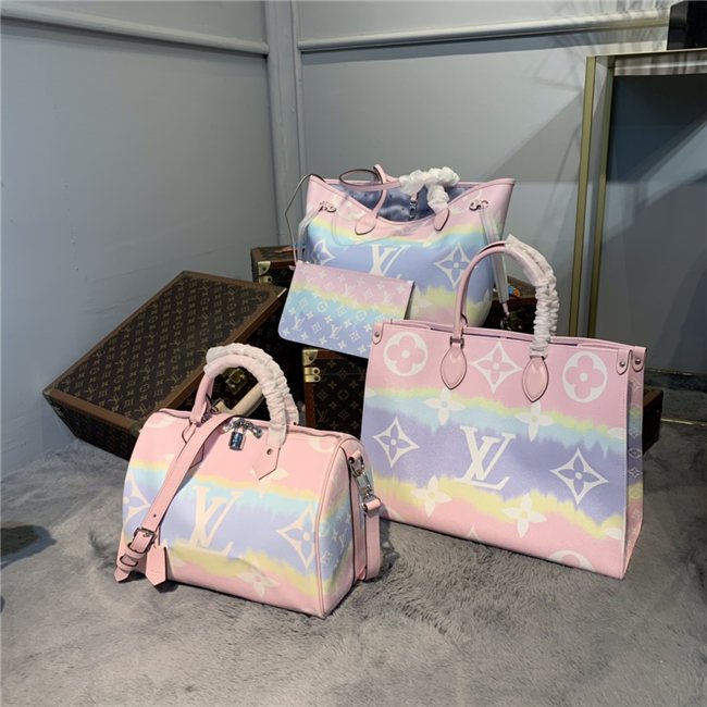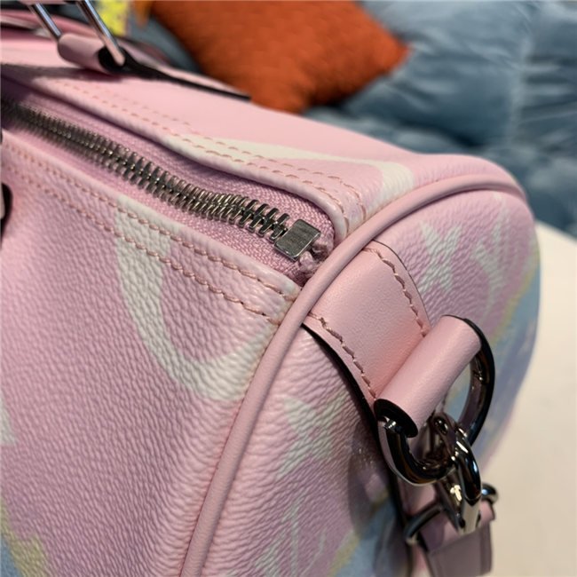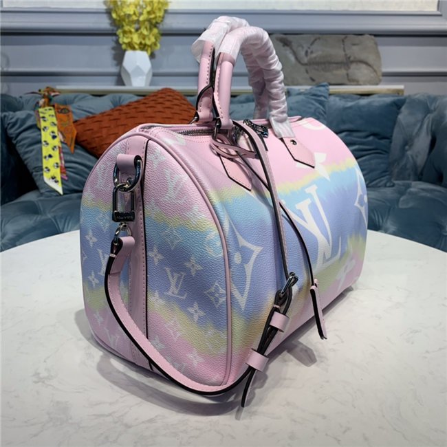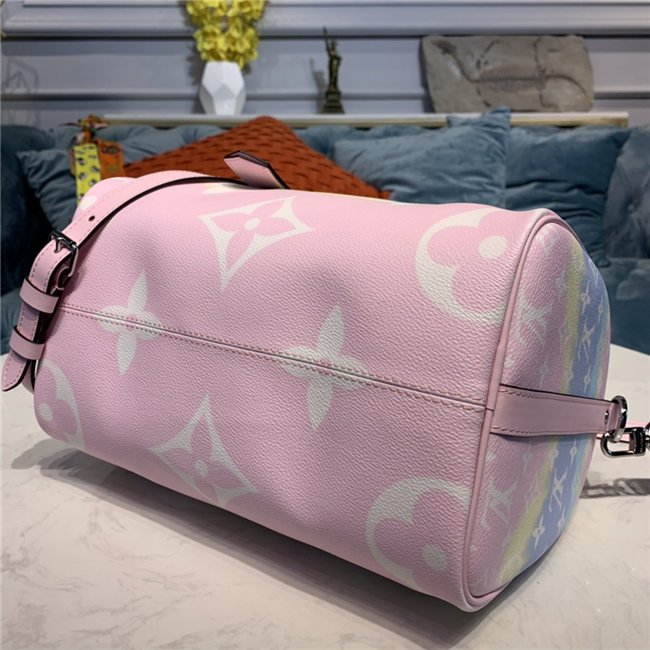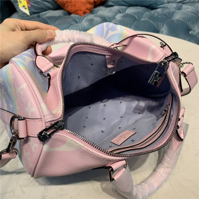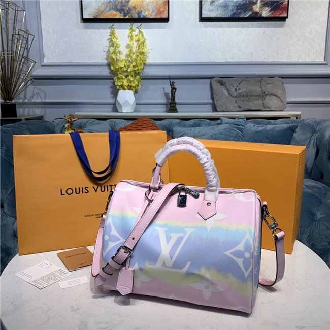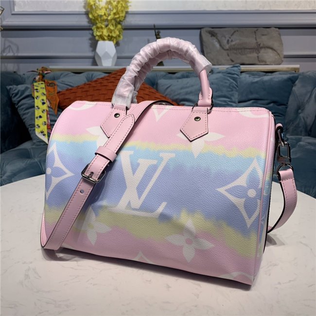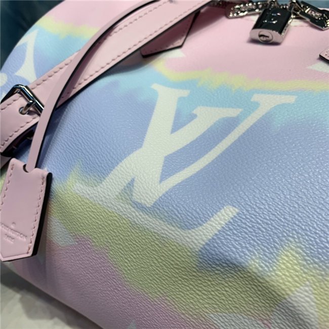Tie-Dye Monogram canvas brings a beachy feel to the Speedy Bandoulière 30, a classic Louis Vuitton city bag relooked for the LV Escale Collection. The rolled-leather handles and distinctive shape make this bag immediately recognizable while the removable strap offers the option of comfortable shoulder carry. It’s signed with the iconic engraved padlock.