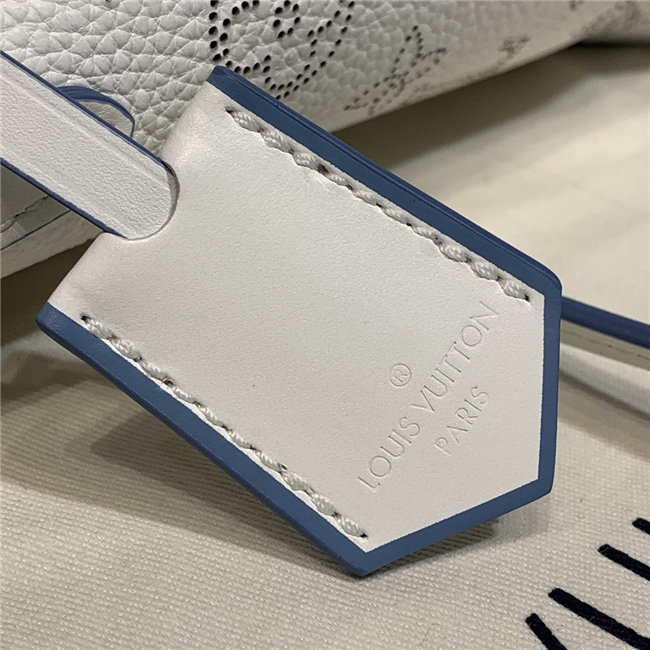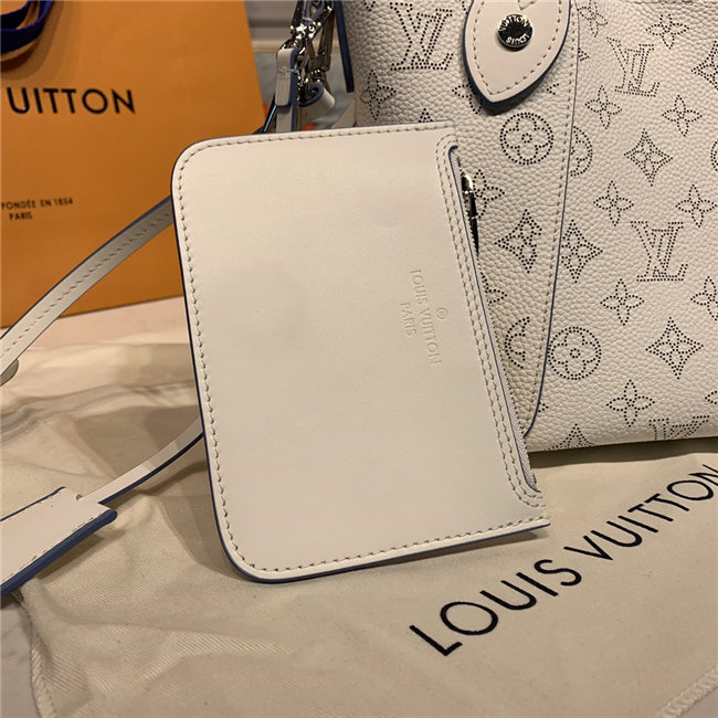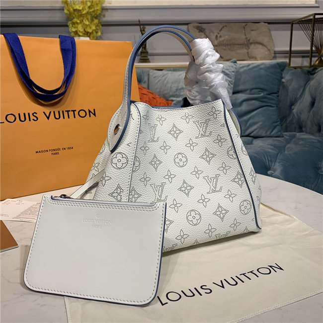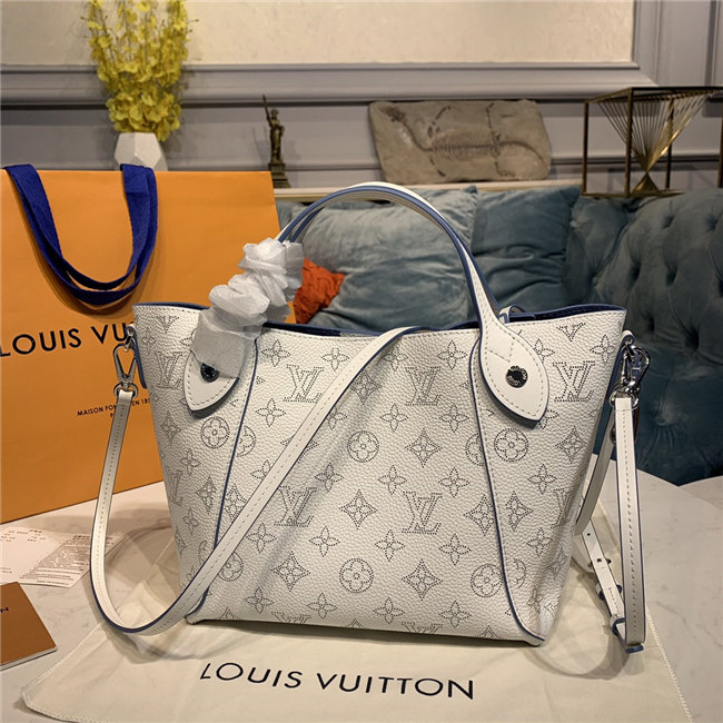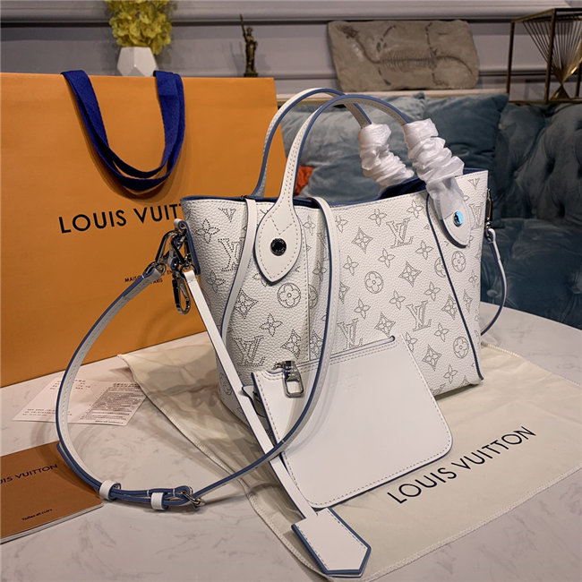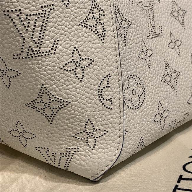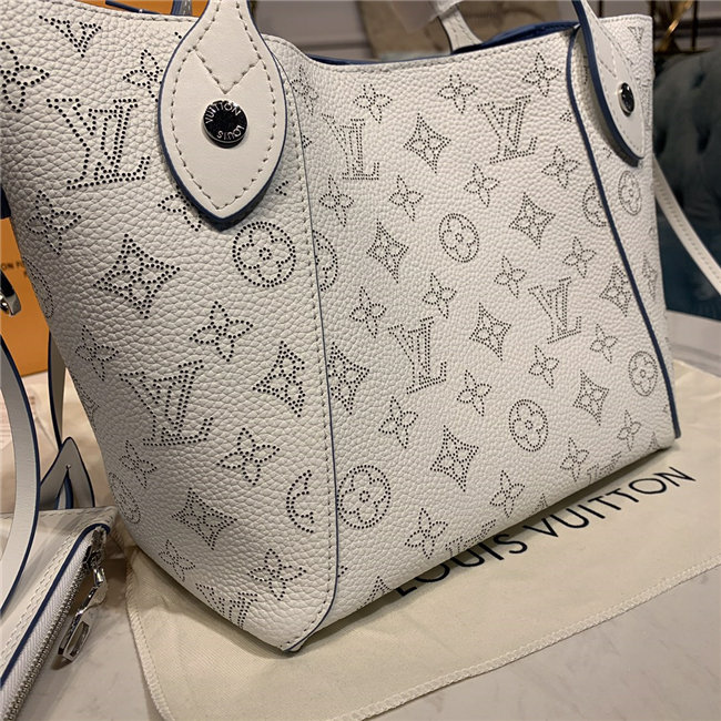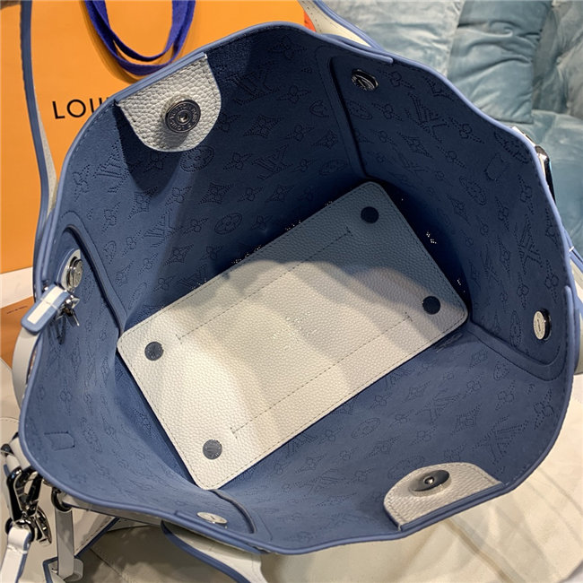 Two bags in one: with its sides gathered in and fastened, the Hina PM is an on-point bucket model; opened wide, it becomes a small casual tote. Made from perforated Mahina calf with calf-leather trim, this model is light and comfortable to carry, either by the two top handles or cross-body on the detachable strap.