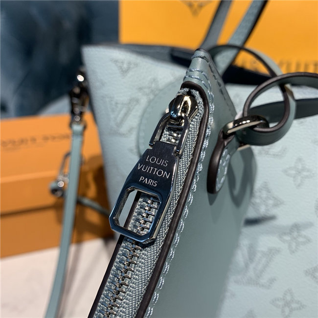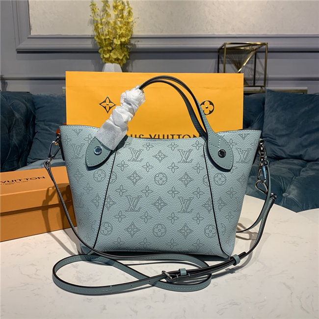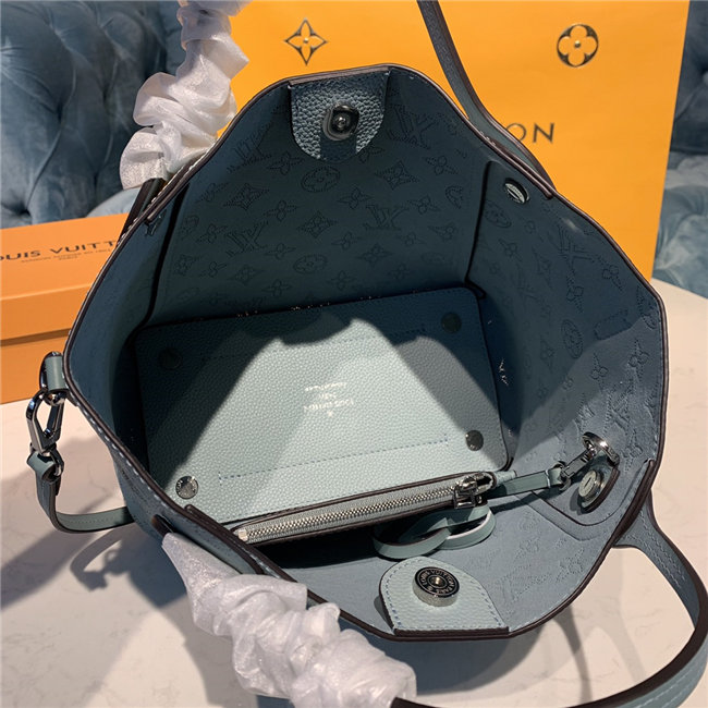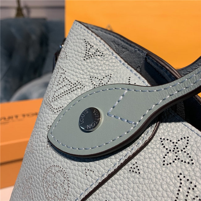 Two bags in one: with its sides gathered in and fastened, the Hina PM is an on-point bucket model; opened wide, it becomes a small casual tote. Made from perforated Mahina calf with calf-leather trim, this model is light and comfortable to carry, either by the two top handles or cross-body on the detachable strap.