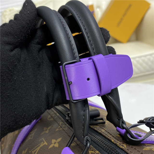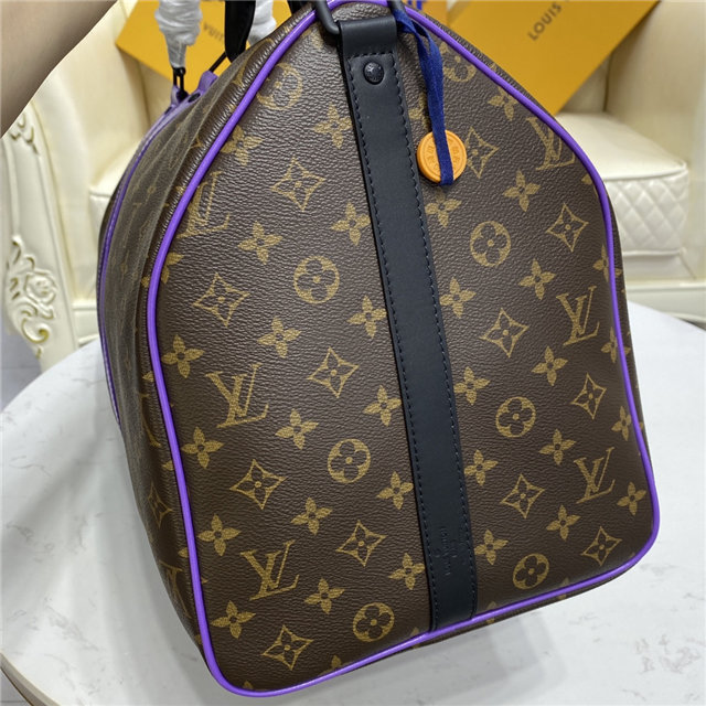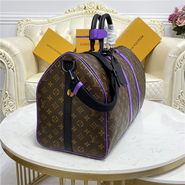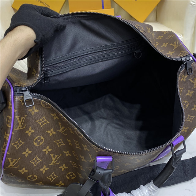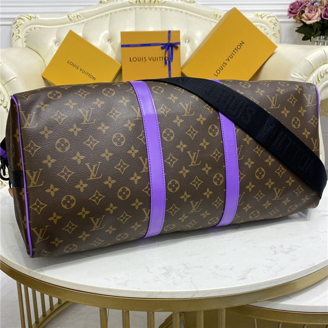 This Keepall Bandoulière 50 travel bag is fashioned from Monogram canvas with purple-leather trim and black-leather top handles. Cabin-friendly with an unexpectedly roomy interior, this iconic weekend bag features a removable strap for comfortable shoulder carry. Unveiled in the 1930s, the Keepall is Louis Vuitton’s original soft travel bag.