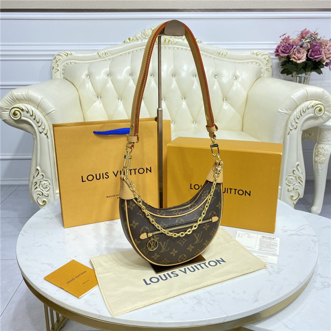 Created by Nicolas Ghesquière for the Cruise 2022 Collection, the Loop handbag is a half-moon baguette, inspired by the Croissant bag from the House archives. It has a body-friendly, compact shape and a chain for shoulder carry, as well as a cross-body leather strap. The front zip pocket closes with a LV Circle zip pull.