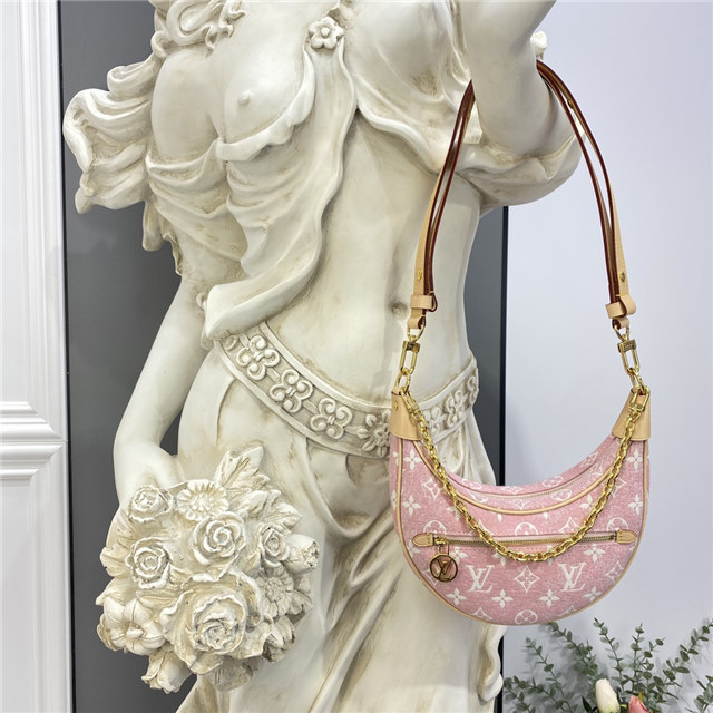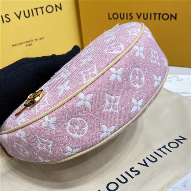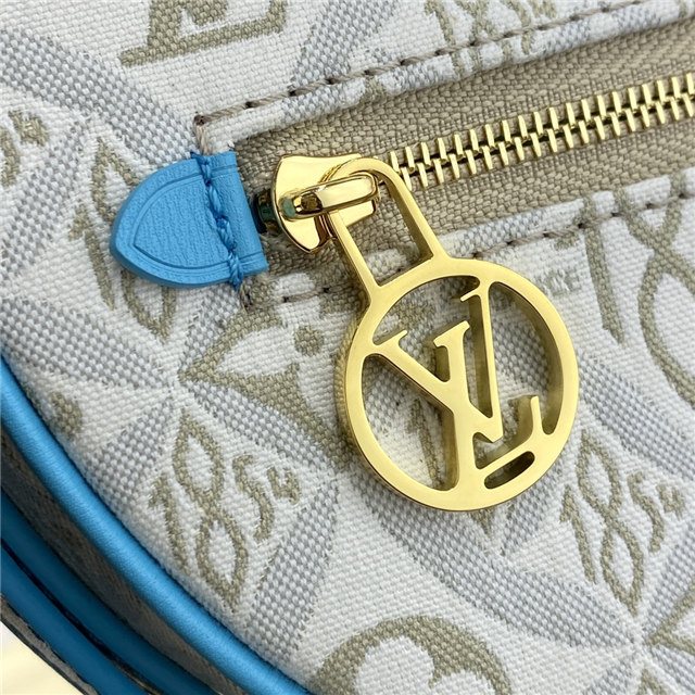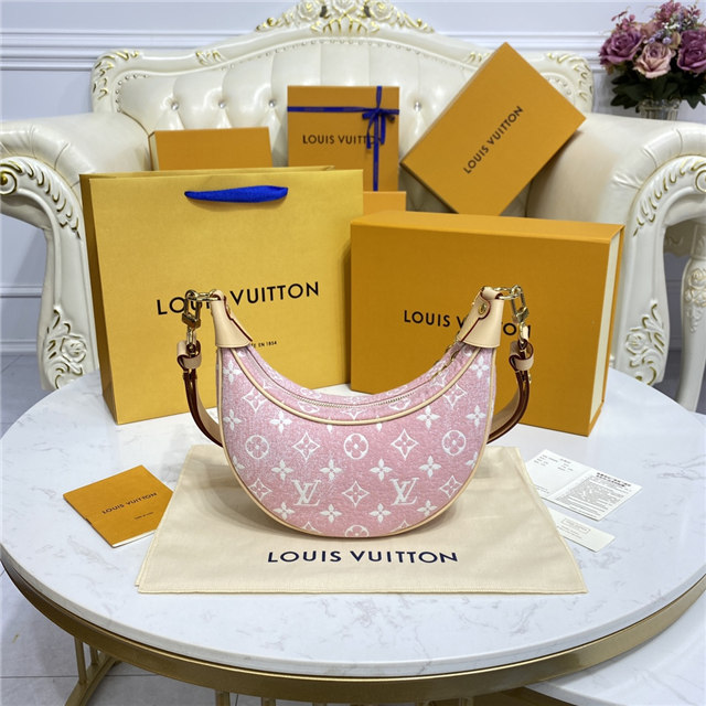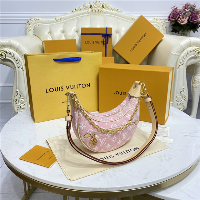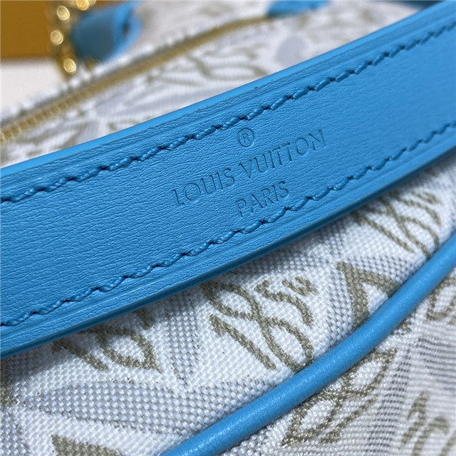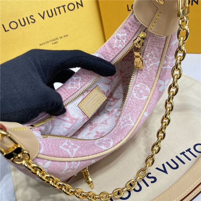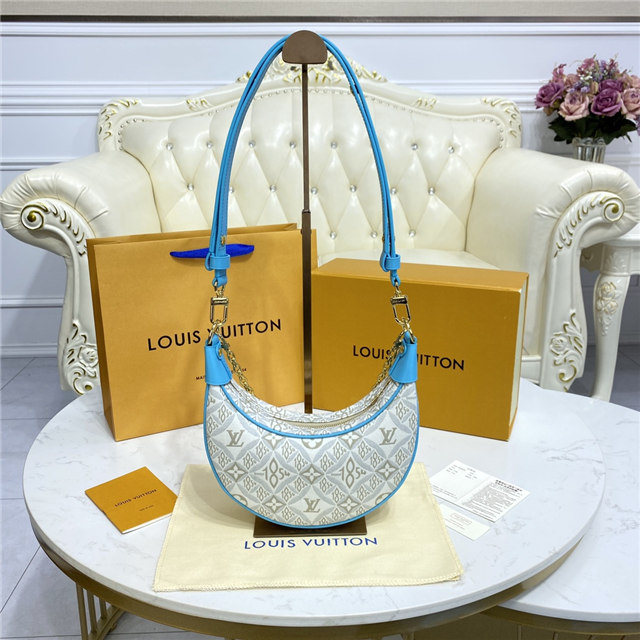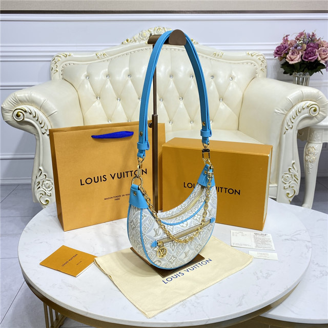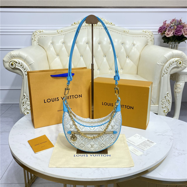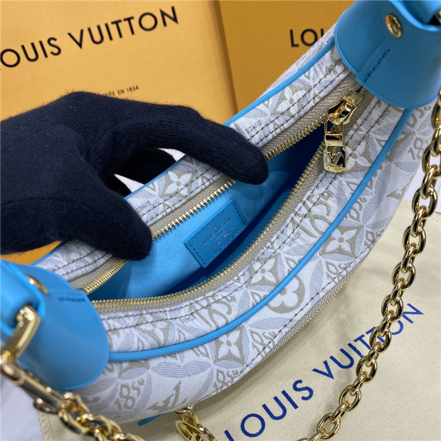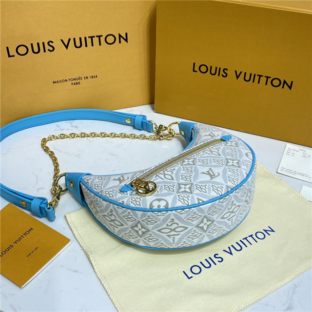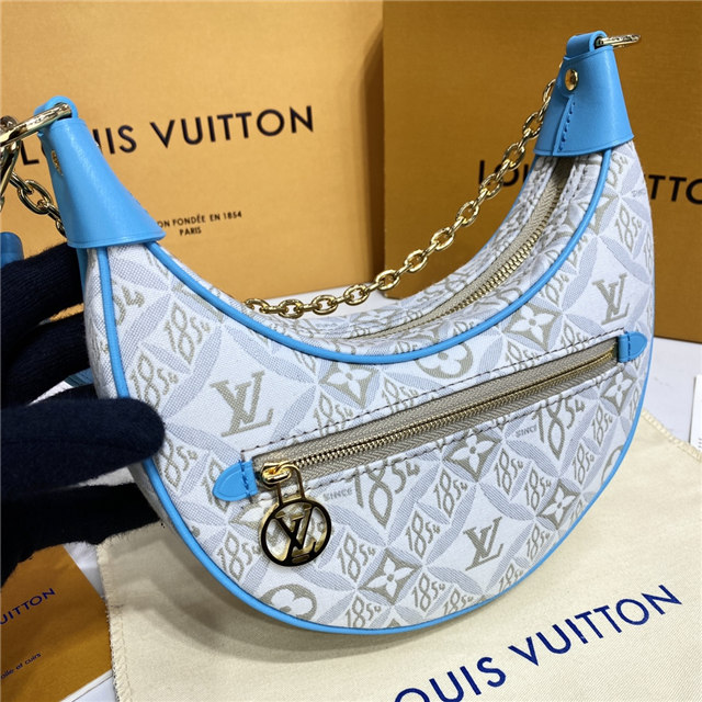 Unveiled by Nicolas Ghesquière at the Cruise 2022 show, the Loop, a half-moon baguette handbag, is made from ecru-colored Since 1854 Jacquard textile and trimmed in light-blue leather. Large enough to carry essentials such as smartphones and wallets, it features a removable gold chain and a front pocket with a LV Circle zip pull.