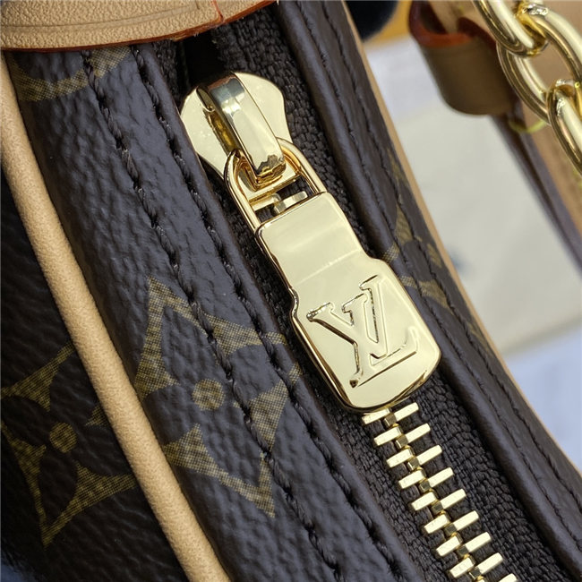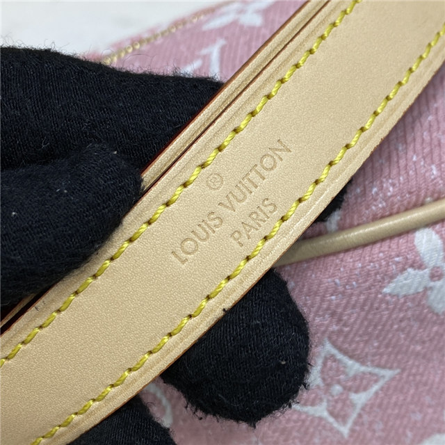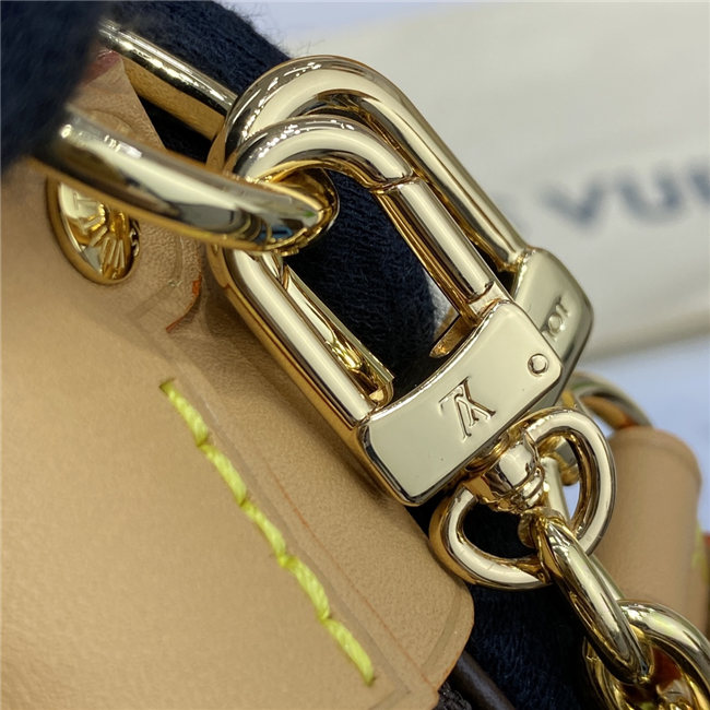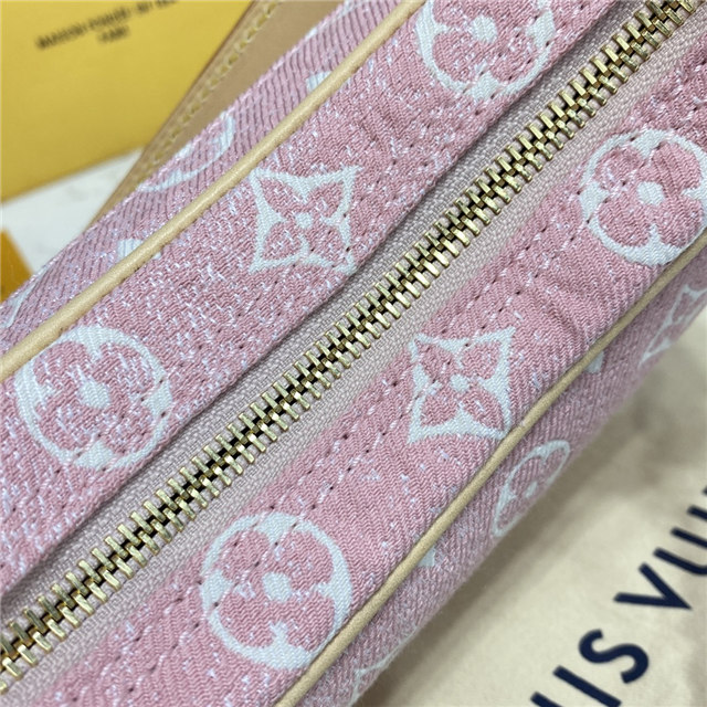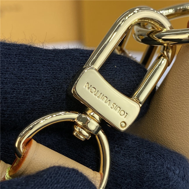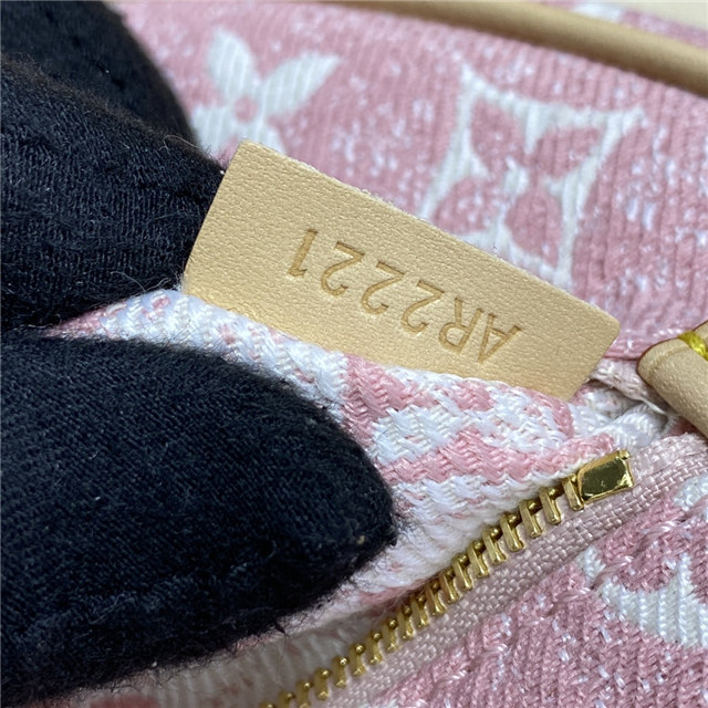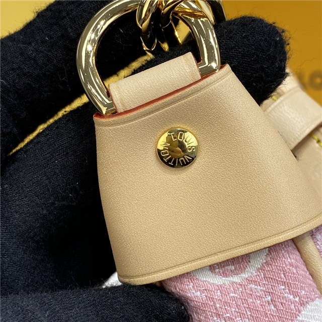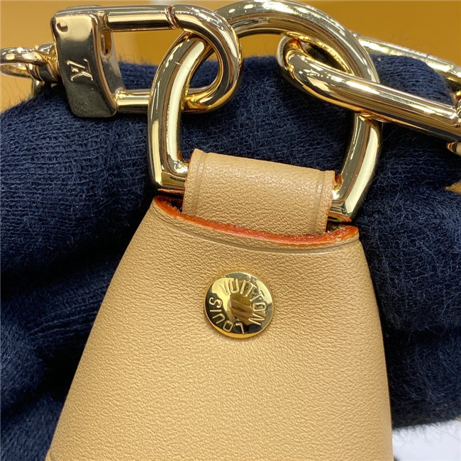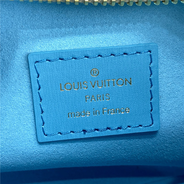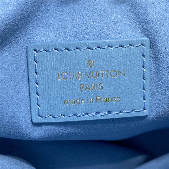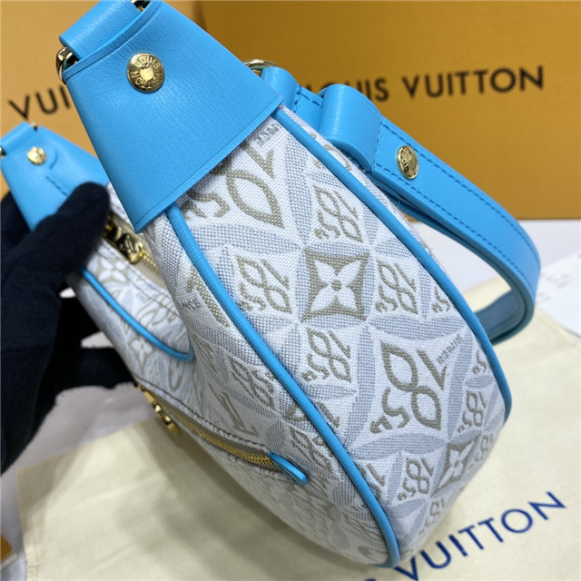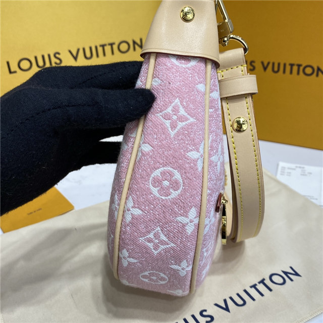 Unveiled by Nicolas Ghesquière at the Cruise 2022 show, the Loop, a half-moon baguette handbag, is made from ecru-colored Since 1854 Jacquard textile and trimmed in light-blue leather. Large enough to carry essentials such as smartphones and wallets, it features a removable gold chain and a front pocket with a LV Circle zip pull.