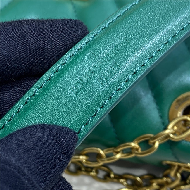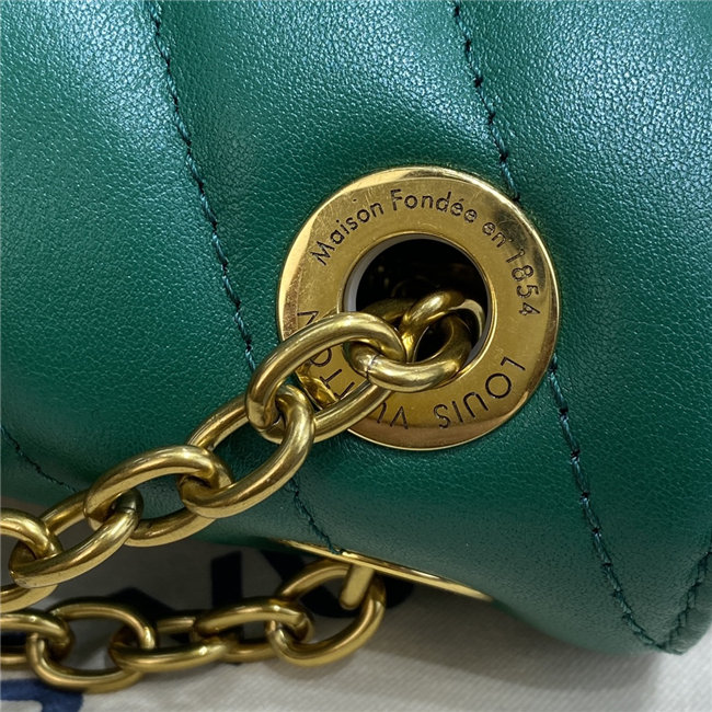 The signature V shaped quilting of this Chain Bag handbag is revisited in smooth cowhide leather. The vintage gold-color chain slides through engraved eyelets while the folded gussets make it supple and body-friendly. The interior enables easy organization of a woman’s essentials thanks to its multiple compartments. The recognizable LV emblem signs the bag.