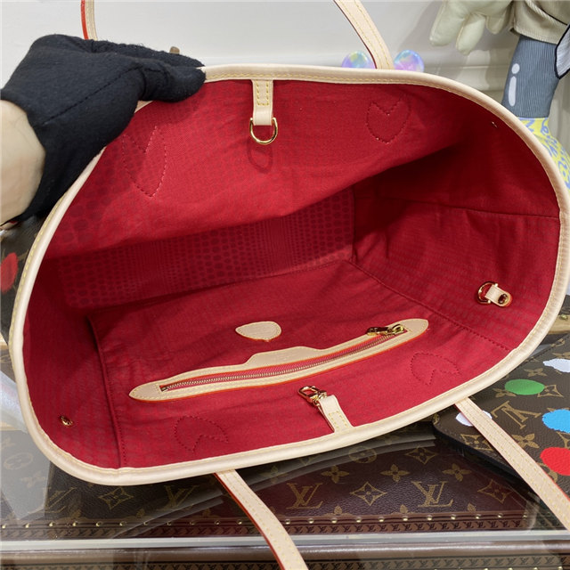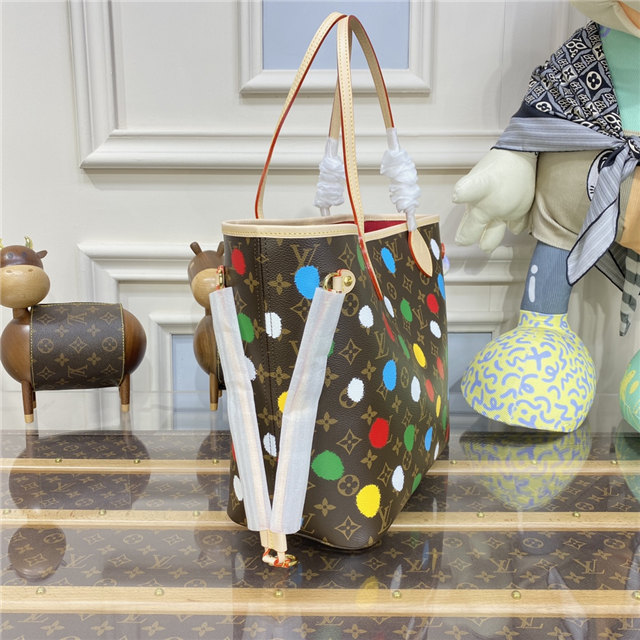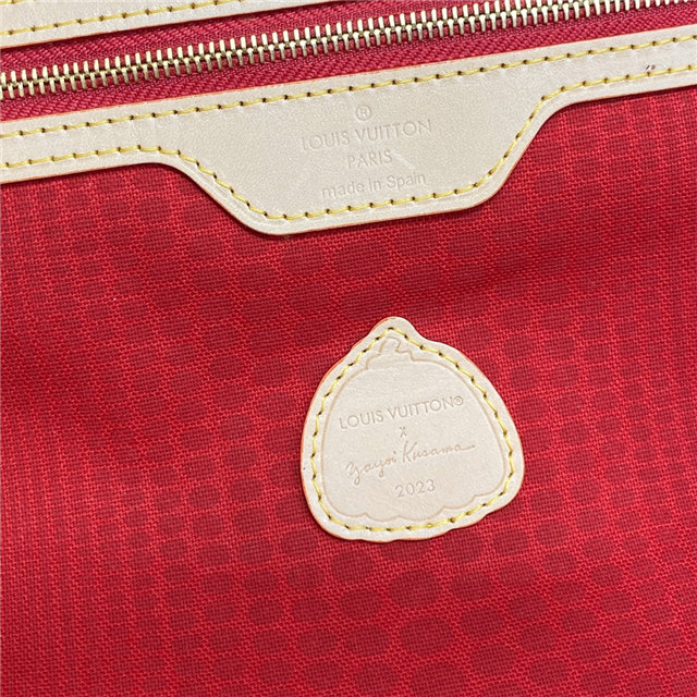 The spacious and elegant LVxYK Neverfull MM tote joins the “Painted Dots” theme as part of the new Louis Vuitton x Yayoi Kusama collaboration. Monogram canvas is decorated with the renowned Japanese artist’s signature dots, a unifying element in her work. A complex screen-printing process gives the colorful dotted pattern a 3D relief effect, adding a burst of vibrant energy to a practical carryall.