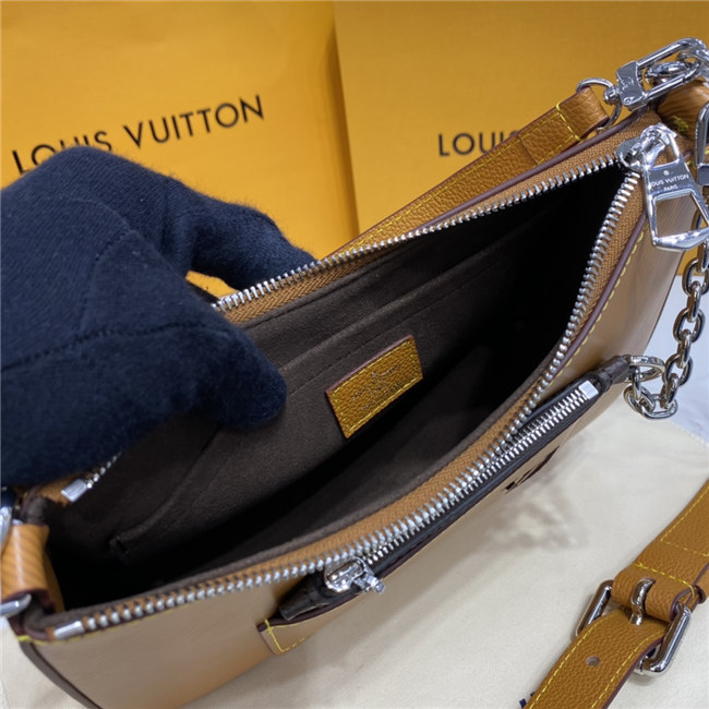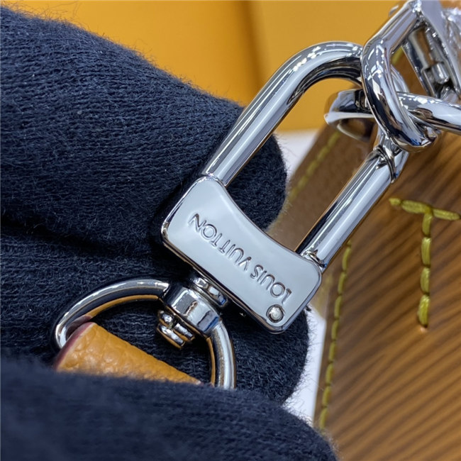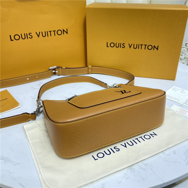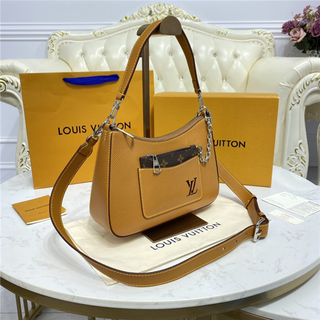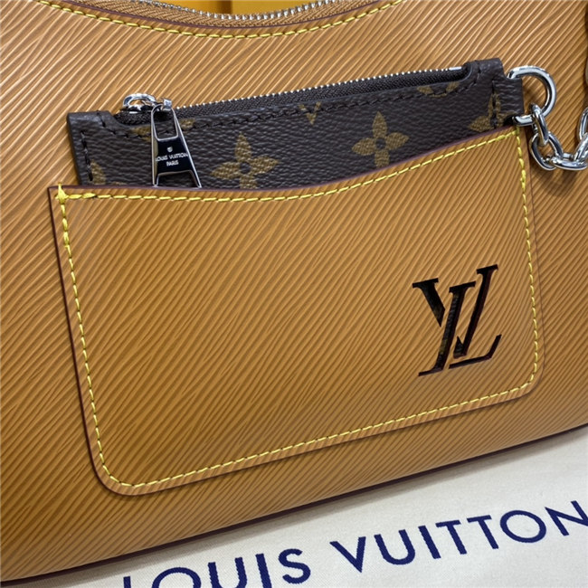 The Marelle handbag is fashioned from grained Epi leather with a detachable canvas pouch that sits in an outside pocket and is attached to the bag with a chain. The Marelle can be carried by hand, elbow or shoulder with its detachable top handle, or worn as a cross-body thanks to its removable and adjustable leather strap.