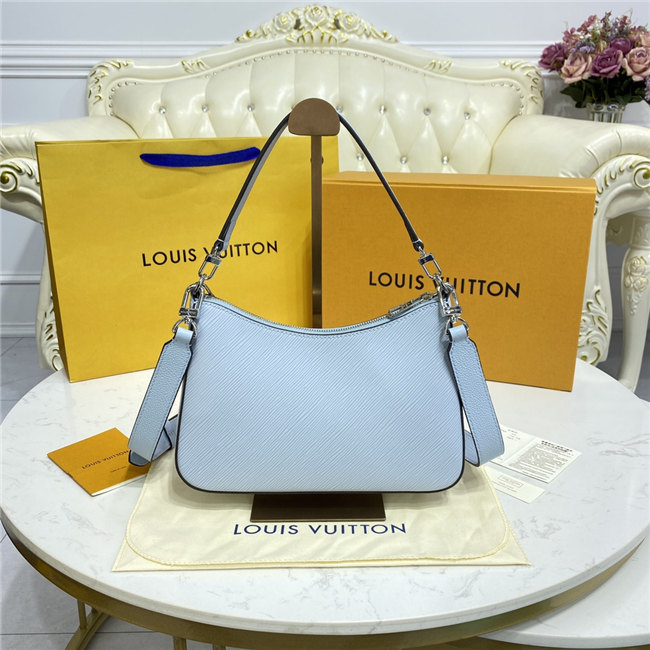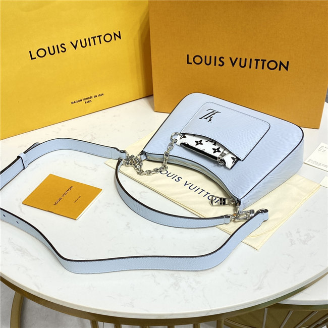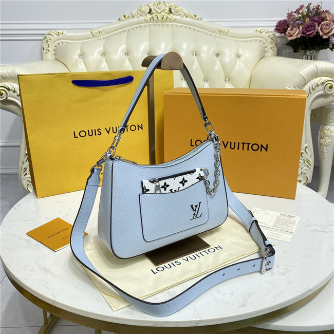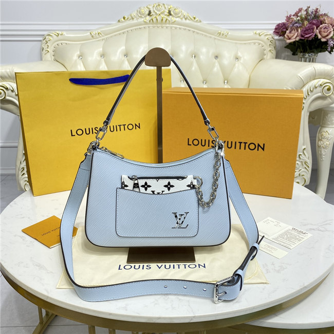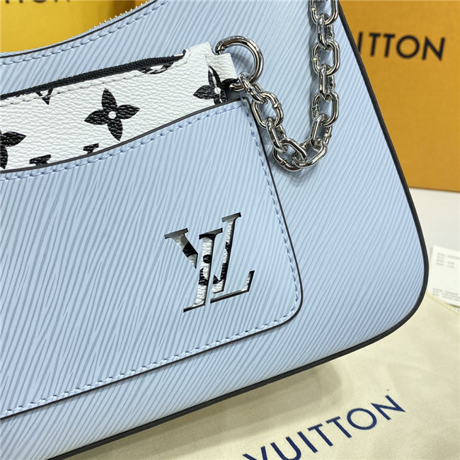 The trendy Marelle is fashioned from grained Epi leather, endowed with a detachable canvas pouch attached to the bag thanks to a silver chain. This subtle touch of Monogram is visible thanks to the LV see-thought crafted in the front pocket of the bag. The Marelle can be carried by hand, elbow or shoulder with its detachable top handle, or worn as a cross-body thanks to its removable and adjustable leather strap.