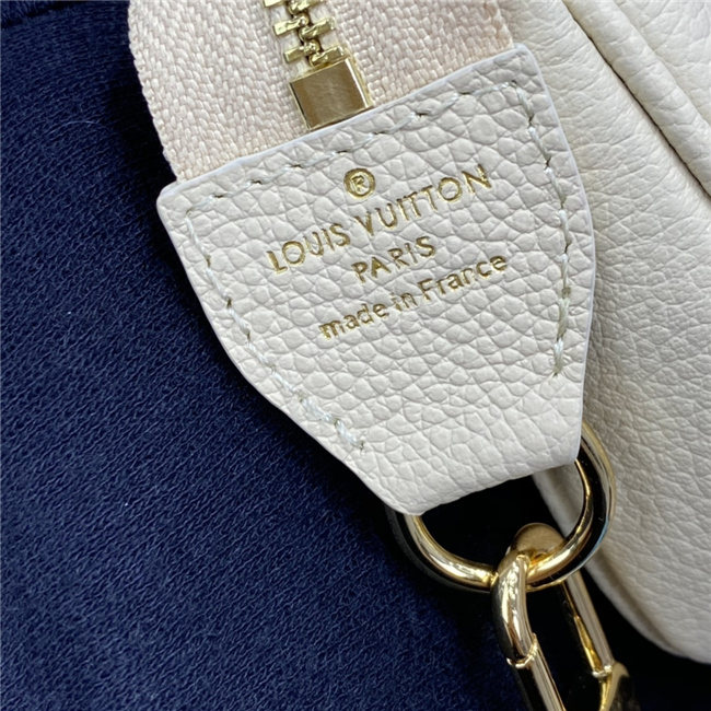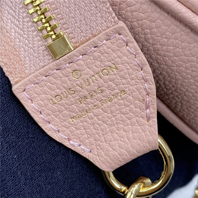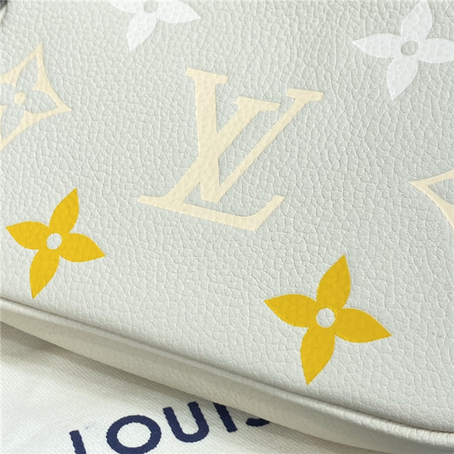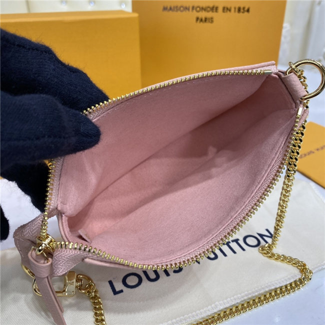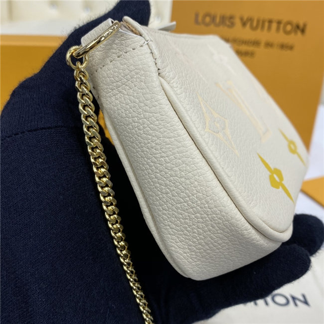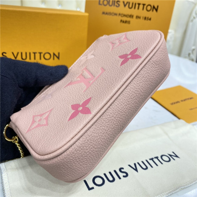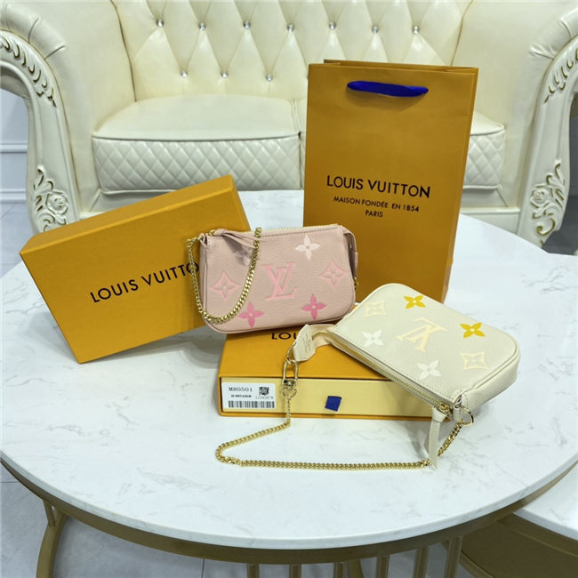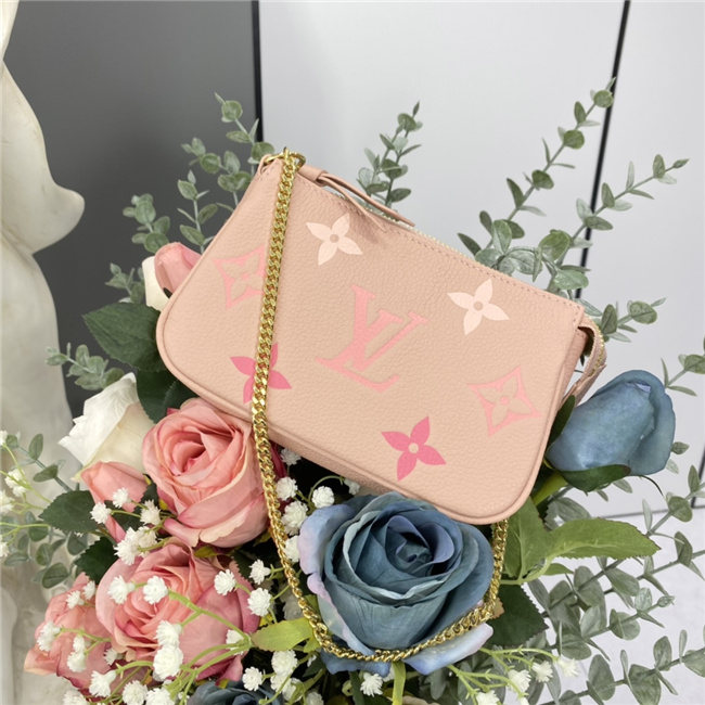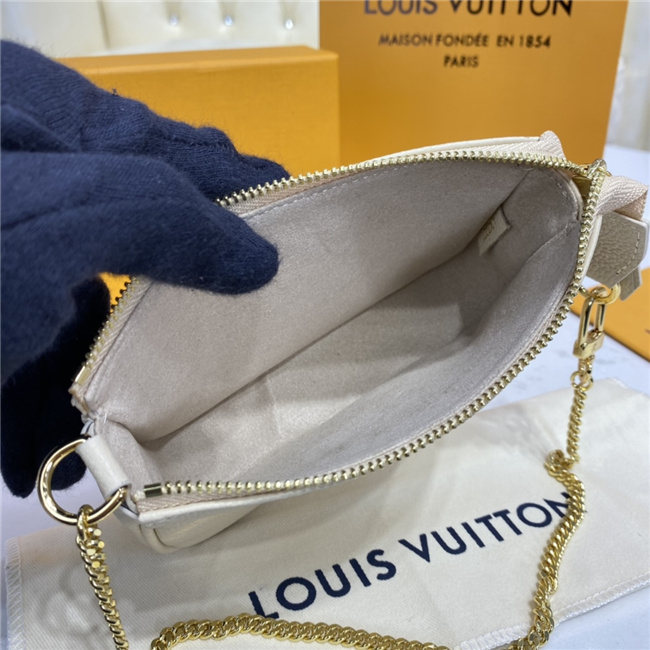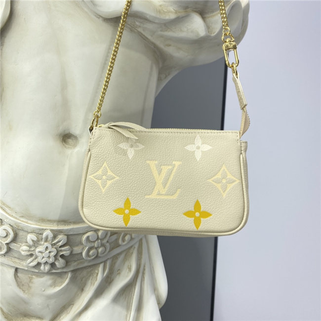 For the By The Pool collection, the Mini Pochette Accessoires is introduced for the first time in Monogram Empreinte leather, with a color gradation on the embossed Monogram pattern. This special edition for Summer 2021 encompasses leather goods, accessories and ready-to-wear. Ideal for essentials, this mini pouch can be attached to a bag or belt thanks to its gold-tone chain.