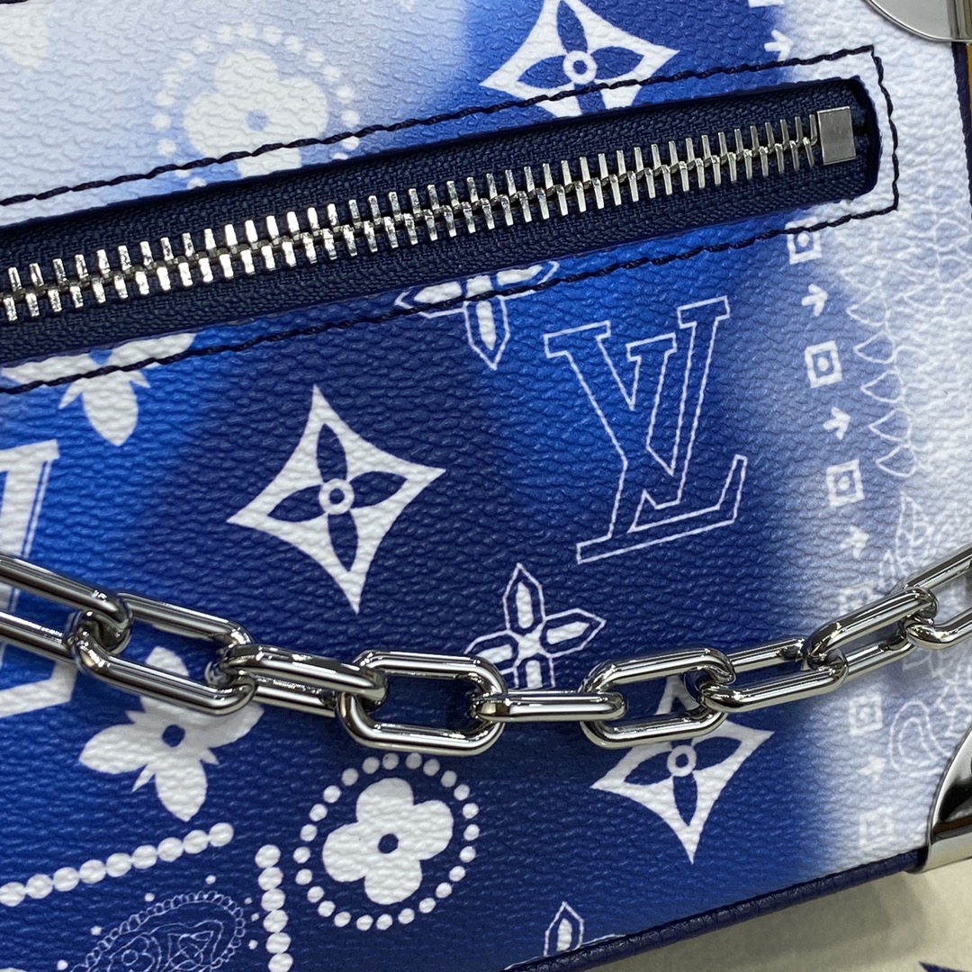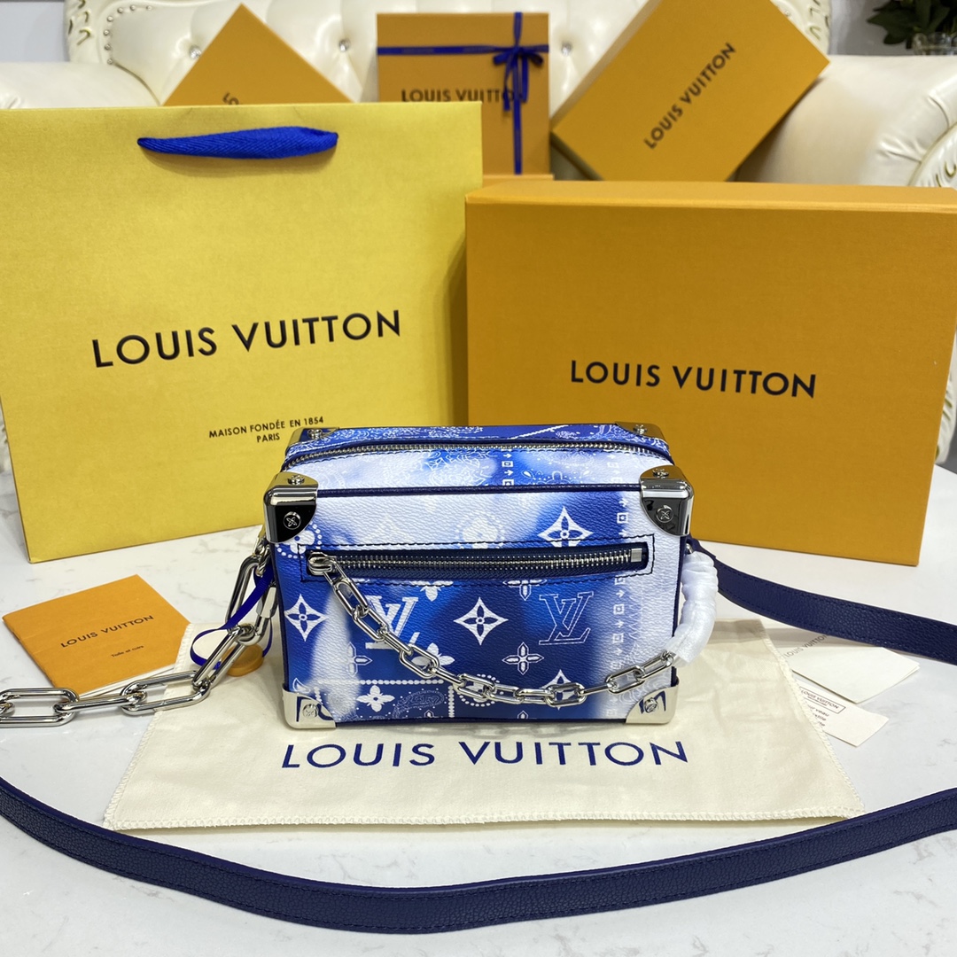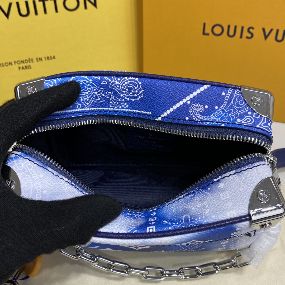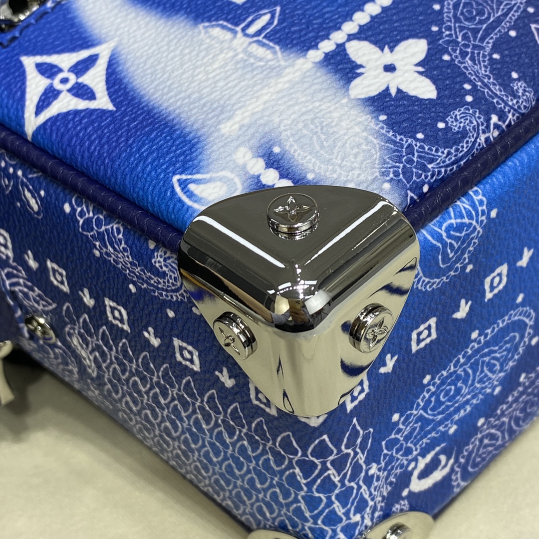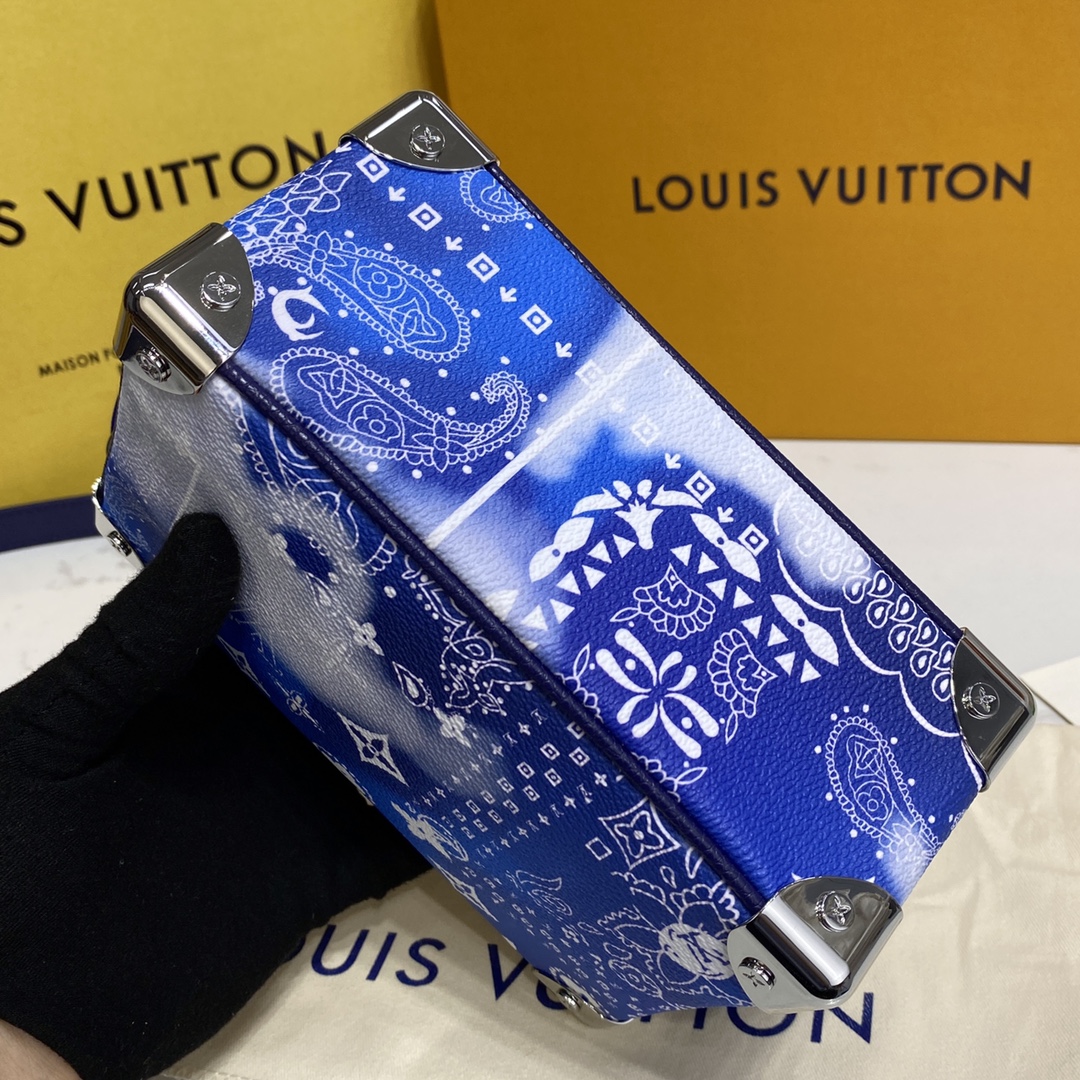 With its shape inspired by Louis Vuitton’s historic travel luggage, the Mini Soft Trunk emanates street-smart chic in Monogram Bandana leather. An original decoration on fine cowhide combines the look of a bleached-out blue bandana with the House’s iconic Monogram pattern. An eye-catching fresh take on a classic motif and a convenient way to carry everyday necessities.