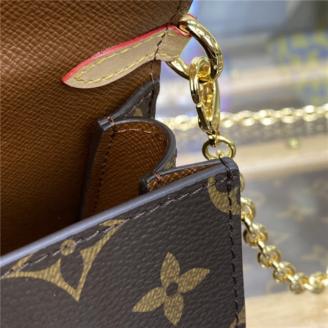 The Bitsy pouch is a new accessory from the Spring-Summer 2023 Cruise collection. This miniature rectangular bag, complete with a removable chain and Métis clasp closure, can be used to store coins, keys or lipstick. The immaculately detailed piece is made of Monogram canvas and enhanced with LV Initials and Monogram Flower charms suspended from the chain.