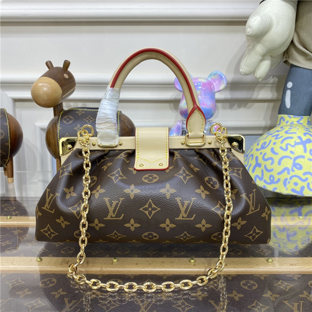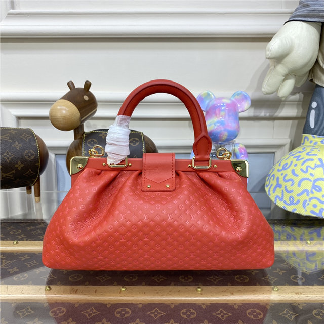 Part of the new Nanogram capsule, the Monogram Clutch is offered in supple calfskin, embossed with a whimisically proportioned Monogram pattern for a subtle two-tone effect. When the rotating handle mounts are tucked inside the bag, they become invisible, turning this bag into an elegant hand-carry purse.