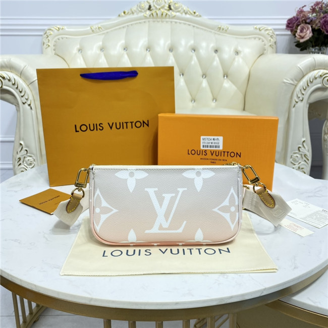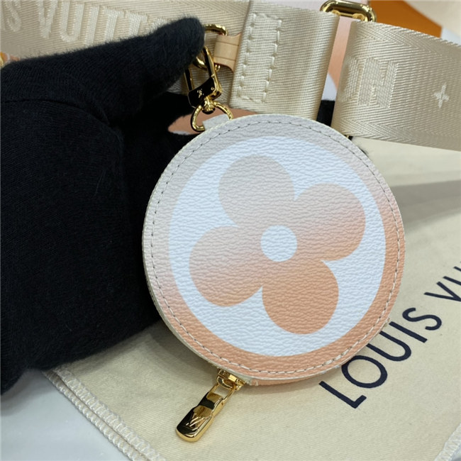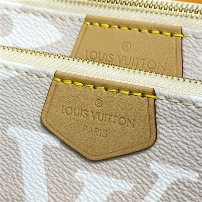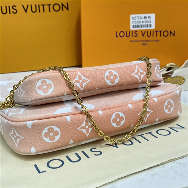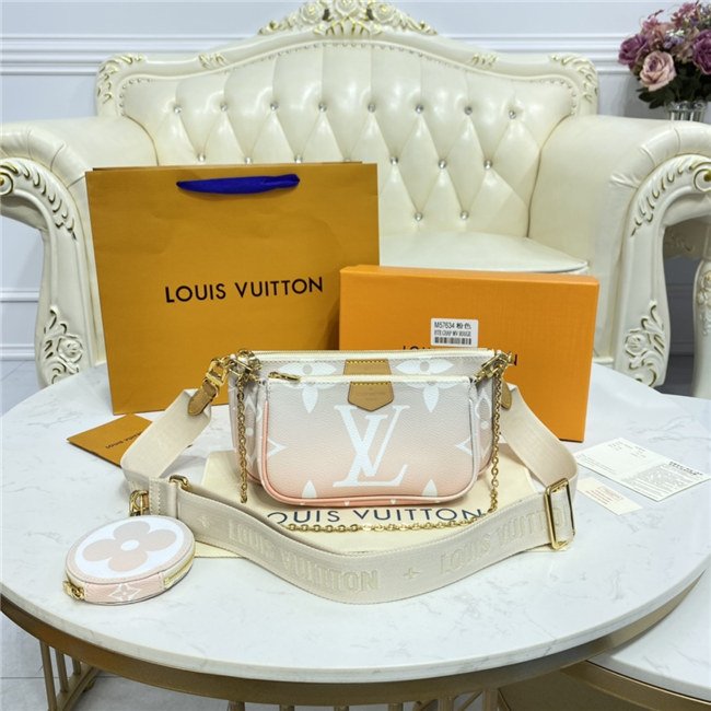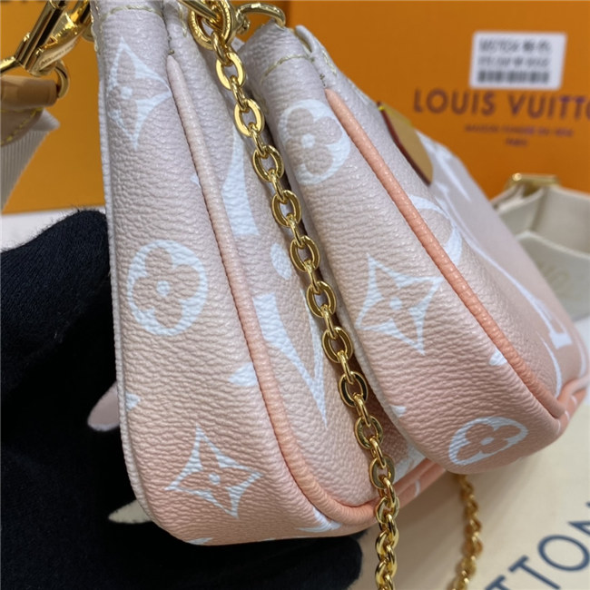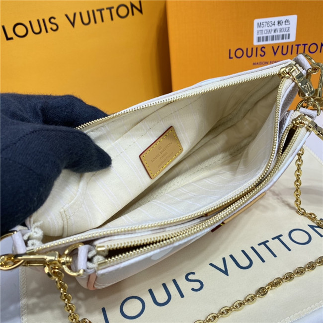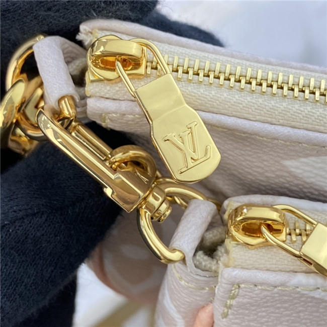 The versatile Multi Pochette Accessoires is composed of a bag, a pouch, and a round coin purse, all made from pastel-colored Monogram Giant canvas. This hybrid bag features an adjustable jacquard strap with Louis Vuitton Malletier inscribed on it for shoulder or cross-body wear as well as a removable gold-color chain for hand and short-shoulder carry.