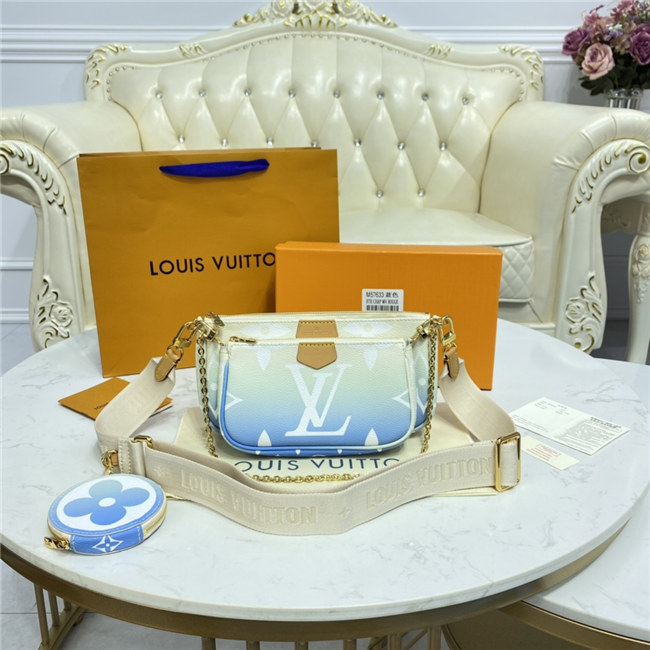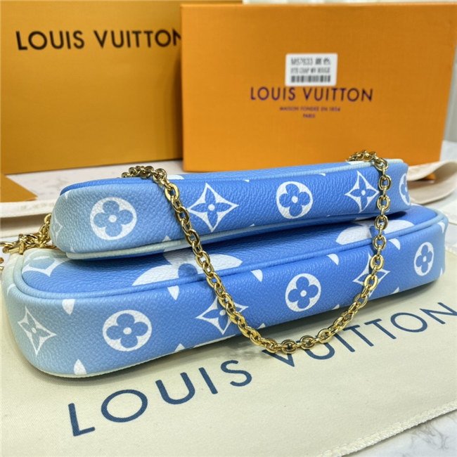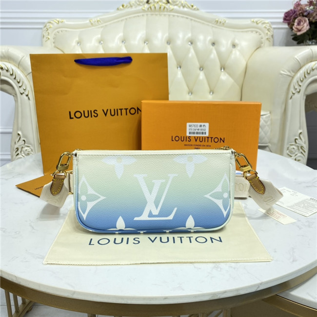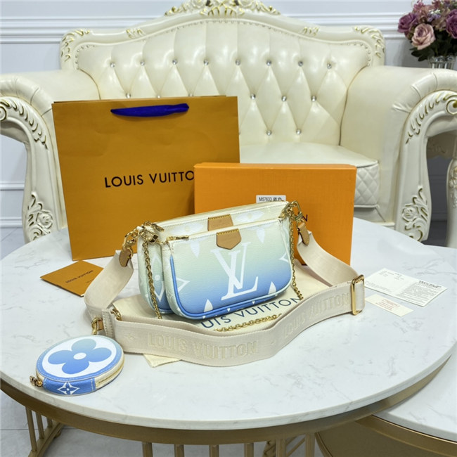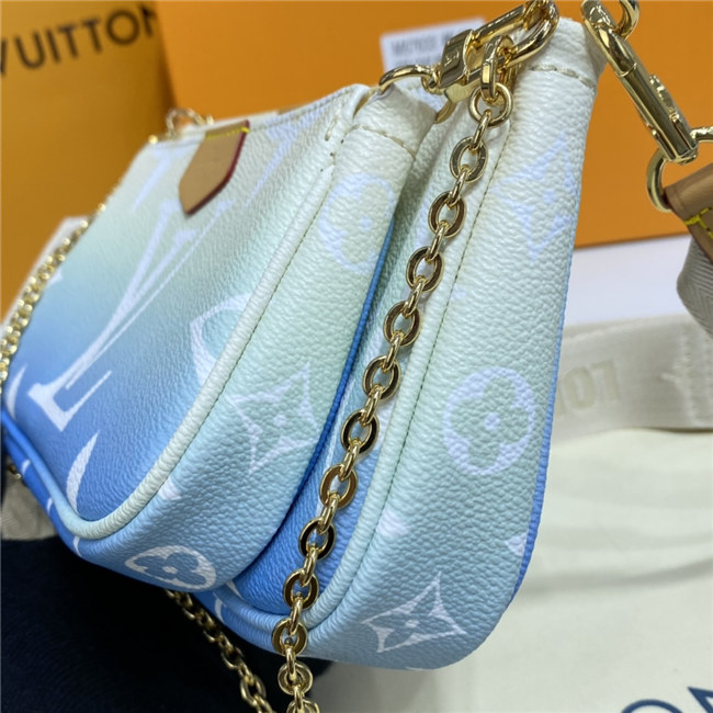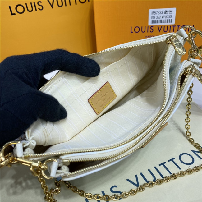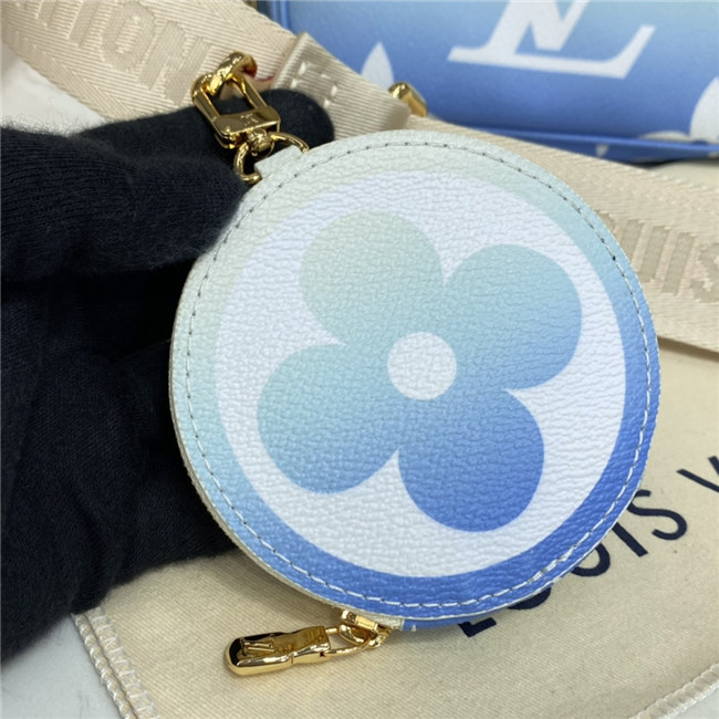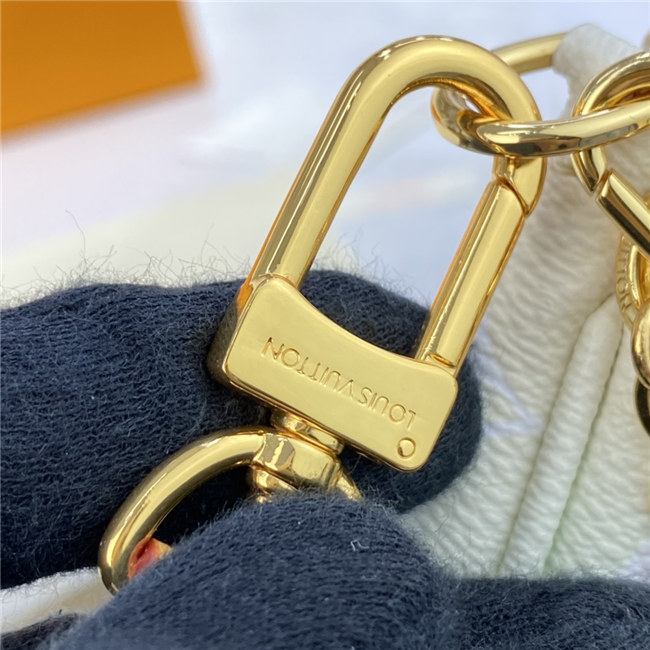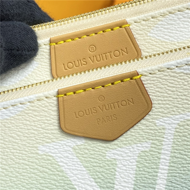 The versatile Multi Pochette Accessoires is composed of a bag, a pouch, and a round coin purse, all made from pastel-colored Monogram Giant canvas. This hybrid bag features an adjustable jacquard strap with Louis Vuitton Malletier inscribed on it for shoulder or cross-body wear as well as a removable gold-color chain for hand and short-shoulder carry.