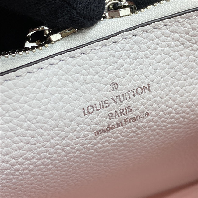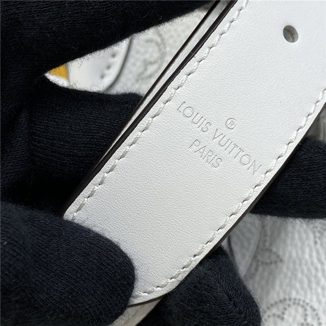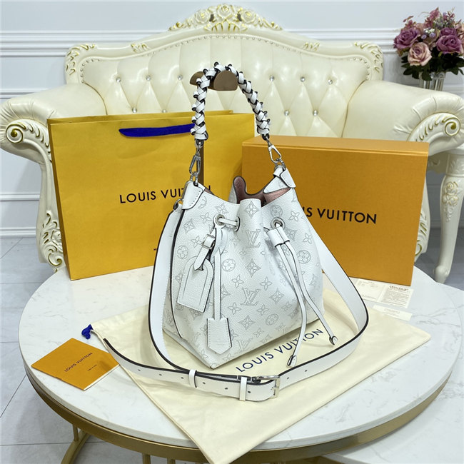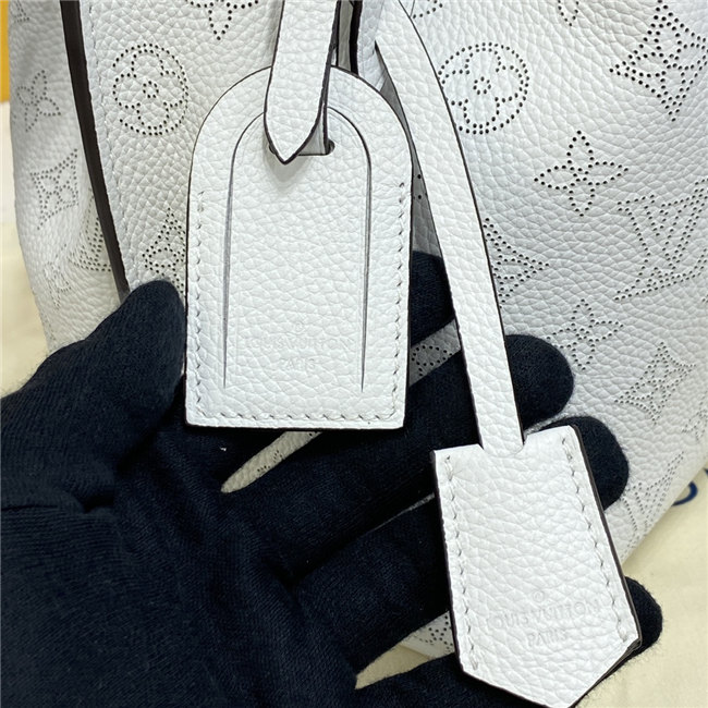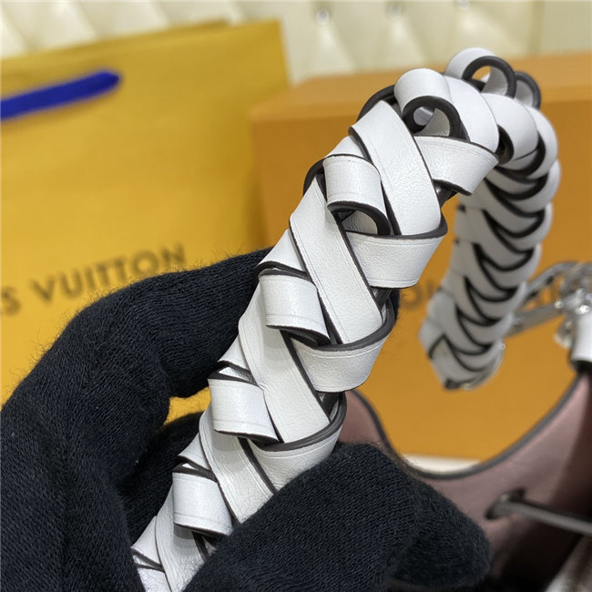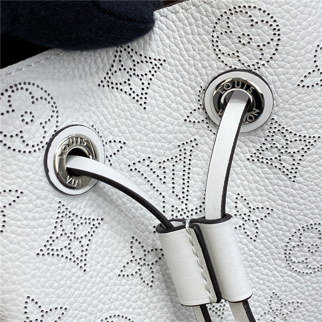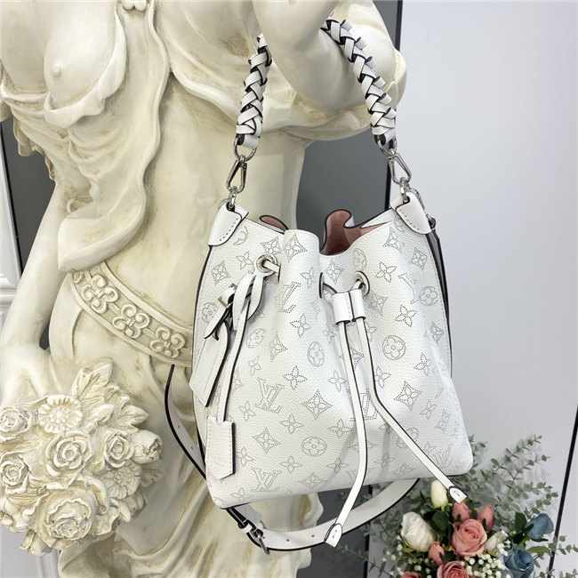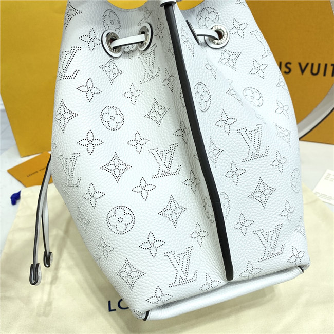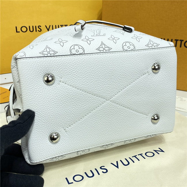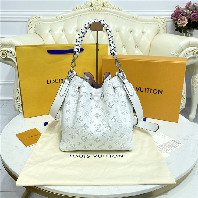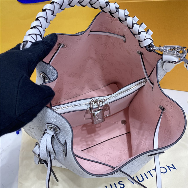 The Muria bucket bag is made from a new iteration of Mahina perforated leather where the tiny holes are blue, red and caramel. Partly colored by hand, this tricolor version of the perforated Monogram pattern brings a bold touch to the white calf leather. The braided top handle completes the picture.