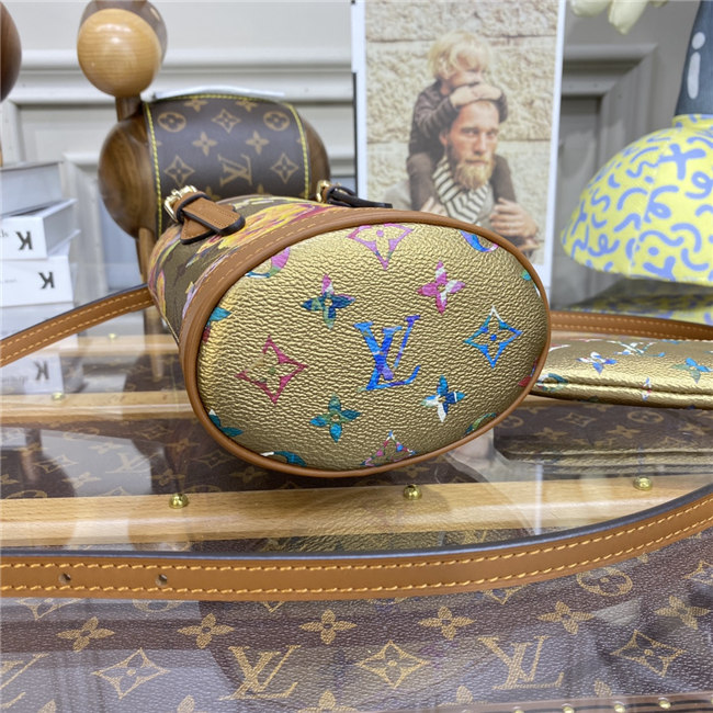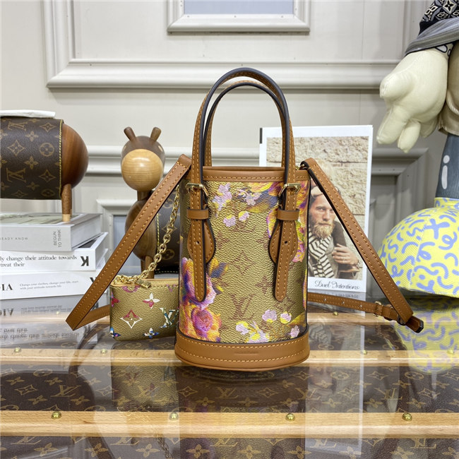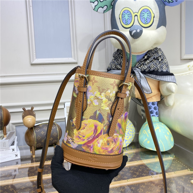 This edition of the Nano Bucket in metallic, flower-pattern canvas is part of the LV Garden animation, which was inspired by Louis Vuitton”s Fall-Winter 2022 show. This miniature bucket bag has two adjustable leather handles and an adjustable, removable shoulder strap. It comes with a modular zipped pouch in floral Monogram canvas, which is perfect for valuables.