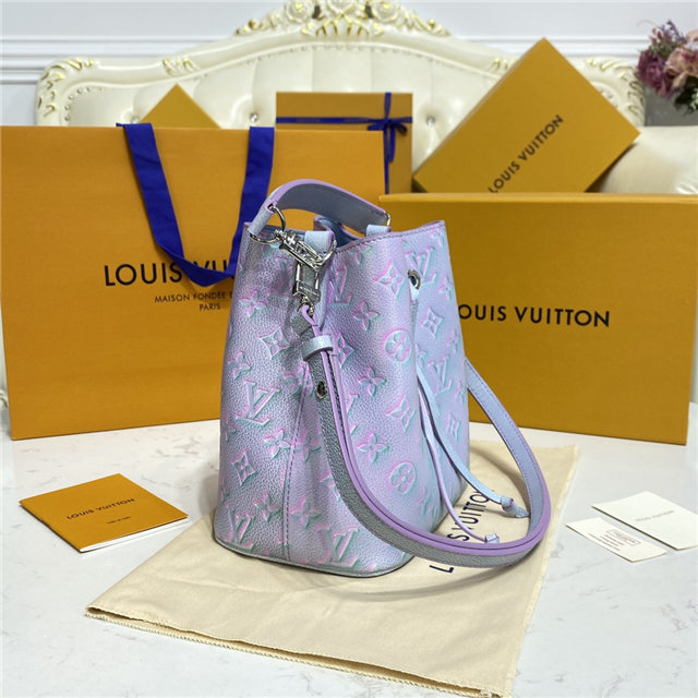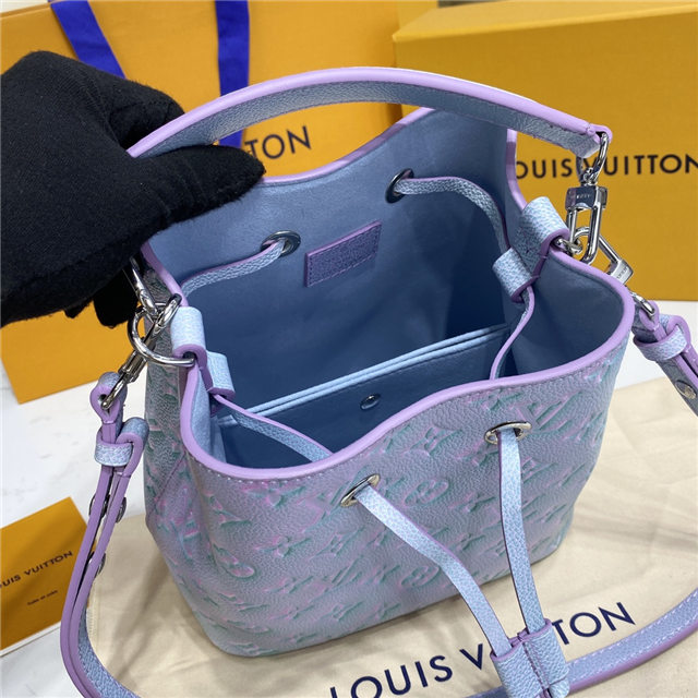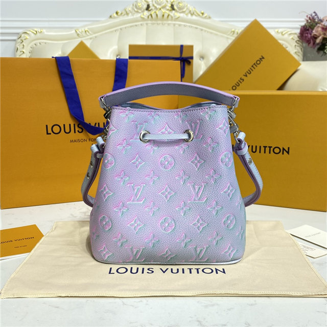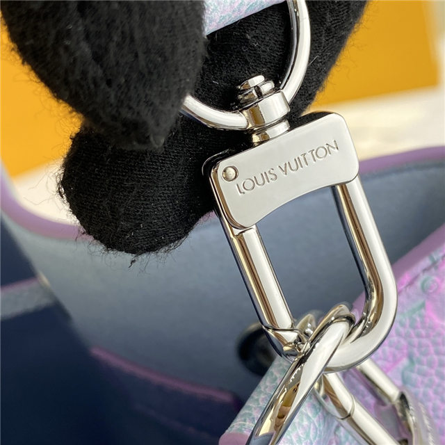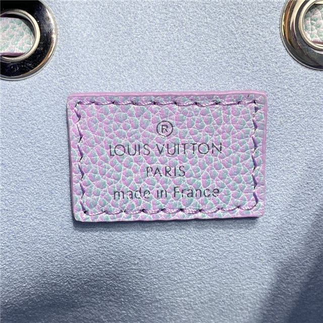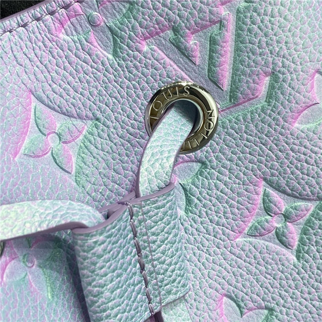 The adorable NeoNoé BB bucket bag is fashioned from the Summer Stardust version of Monogram Empreinte leather, a three-step spraying process giving the leather a shimmering aspect. A removable top handle and detachable strap provide carry options. The bag closes with a drawstring while the inside central pocket closes with a press stud.