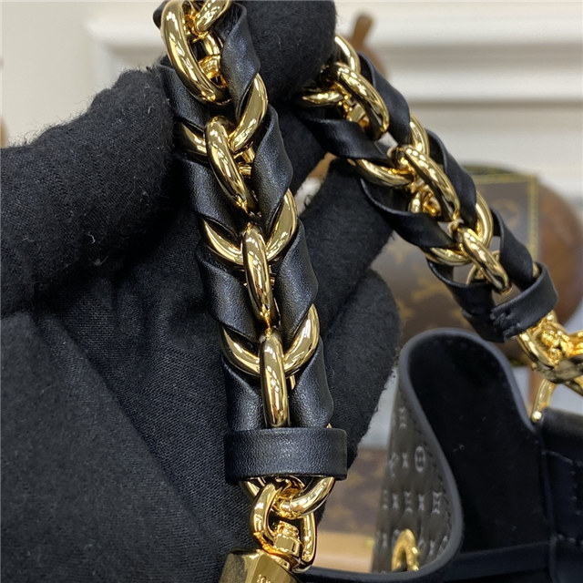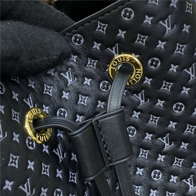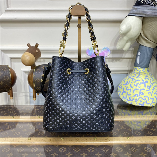 The NeoNoé BB bucket bag is made from supple calfskin leather embossed with the Nano Monogram pattern; the tiny LVs and Monogram Flowers printed in a delicately contrasting tone. The color of the leather braiding on the detachable chain and the leather on the shoulder strap match that of the bag.