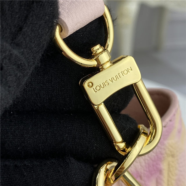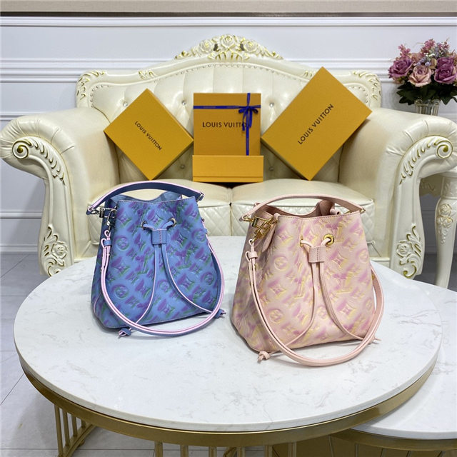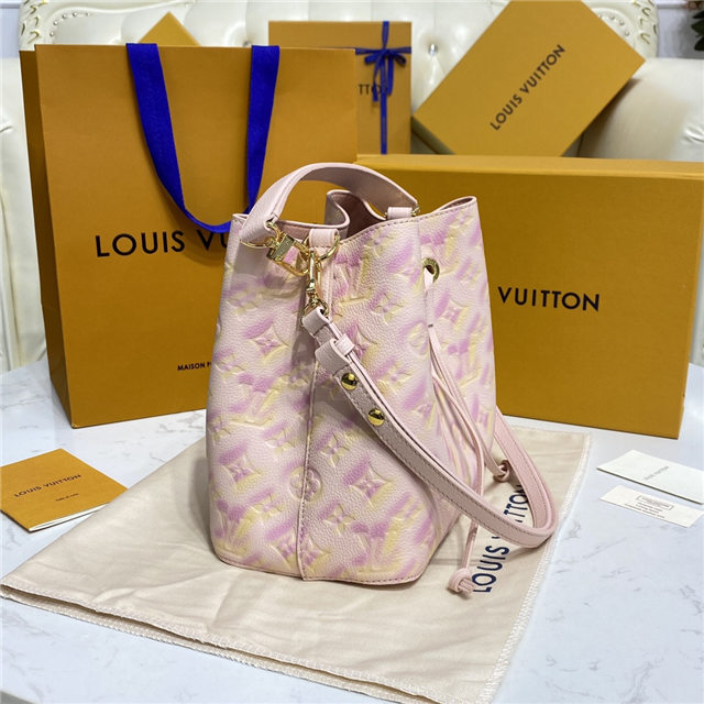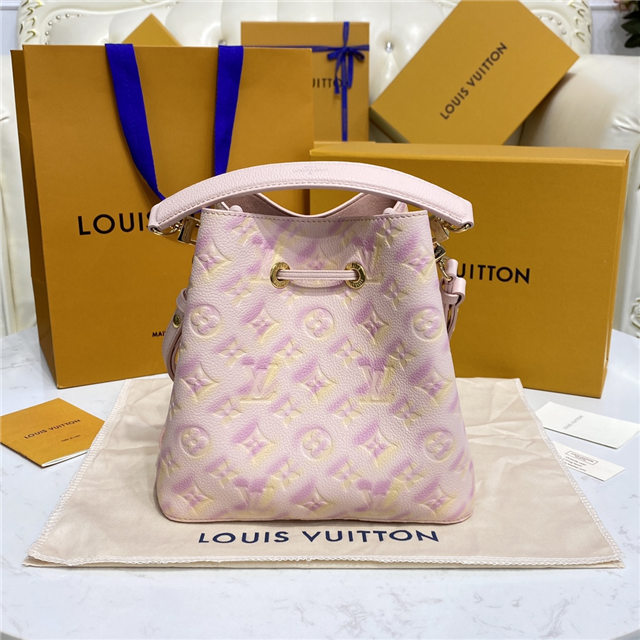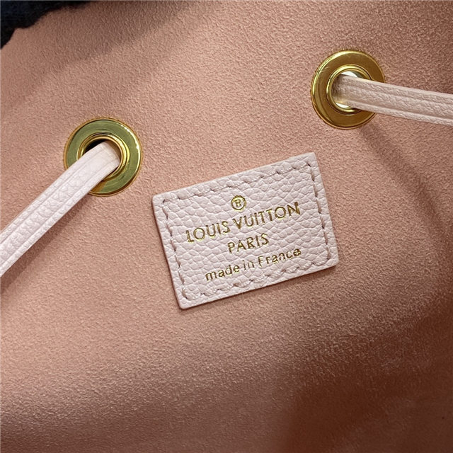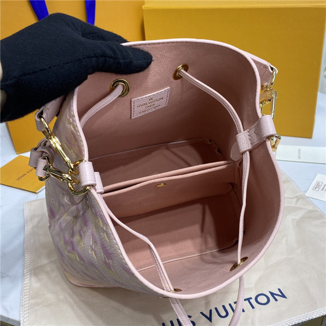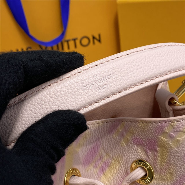 The adorable NeoNoé BB bucket bag is fashioned from the Summer Stardust version of Monogram Empreinte leather, a three-step spraying process giving the leather a shimmering aspect. A removable top handle and detachable strap provide carry options. The bag closes with a drawstring while the inside central pocket closes with a press stud.