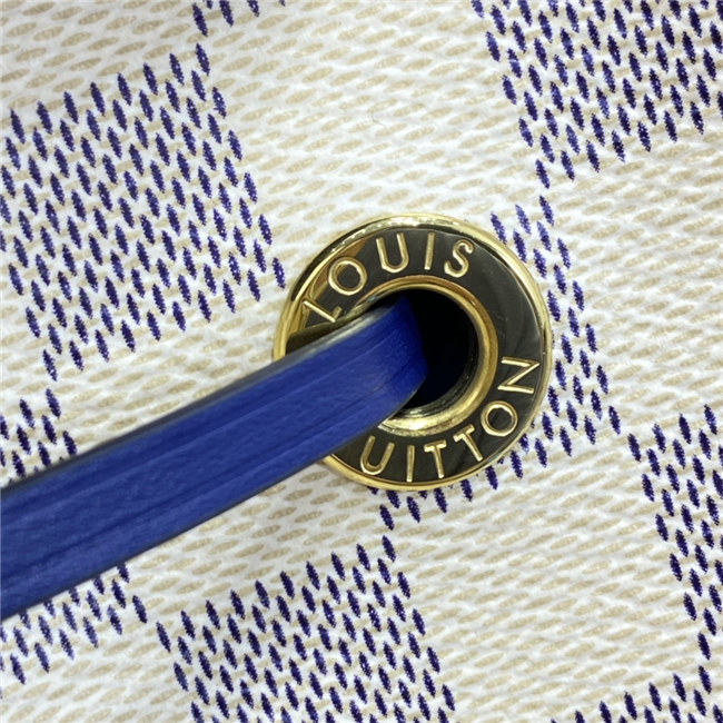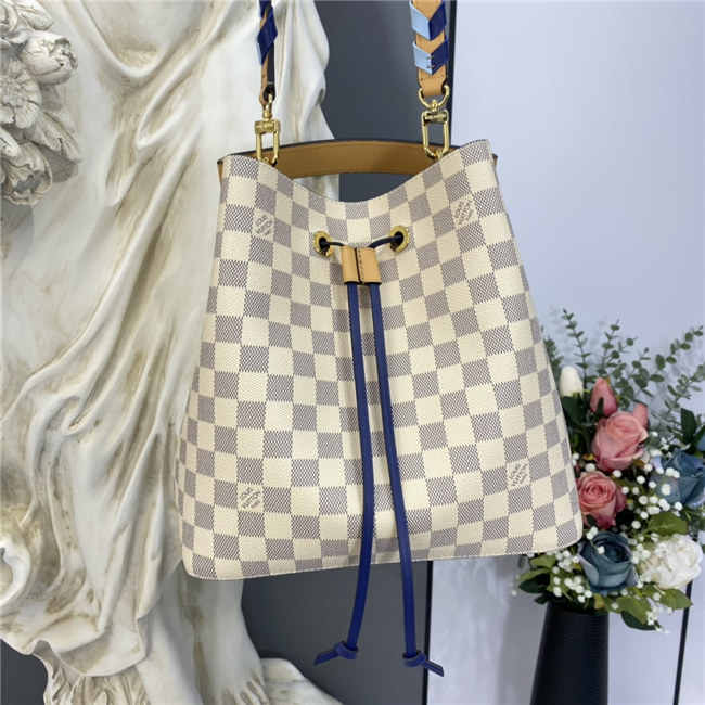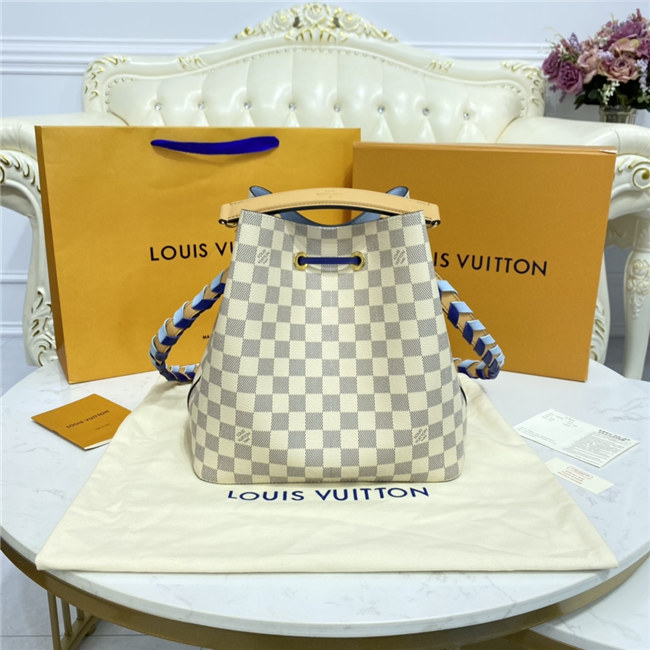 Fashioned from Damier Azur Canvas, this Néonoé MM bucket bag features a detachable leather top handle and a hand-braided bicolor leather shoulder strap. The Néonoé revisits a 1932 design by Gaston-Louis Vuitton.
