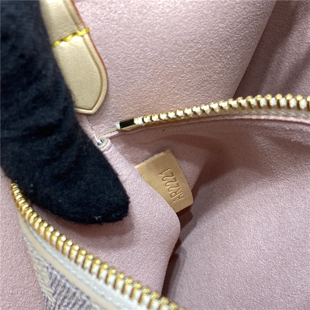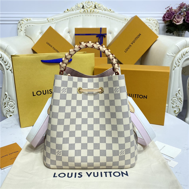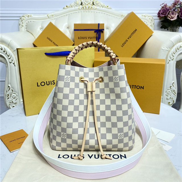For Summer 2020, the NéoNoé bucket bag in Damier Azur canvas features a braided-leather top handle. The hand-painted edge-dyeing of the top-handle leather is a gauge of the House’s commitment to craftsmanship. It can be hand-carried or worn over the shoulder and cross-body, with its bicolor, removable leather strap.