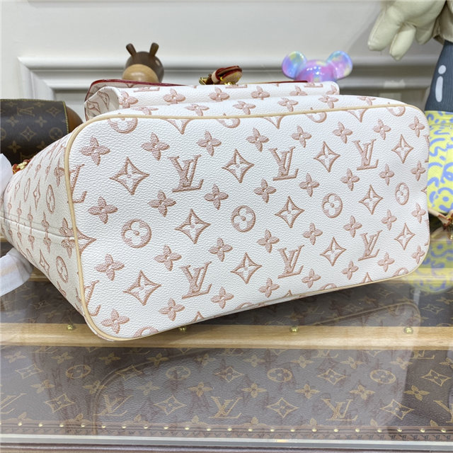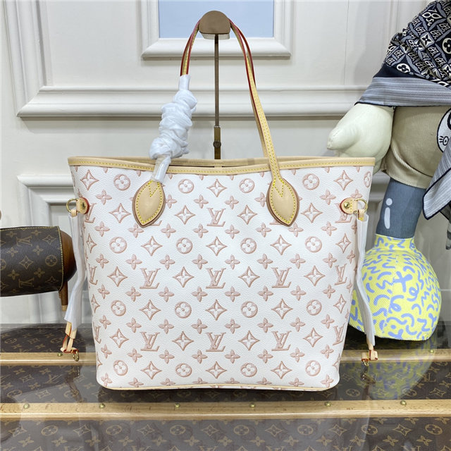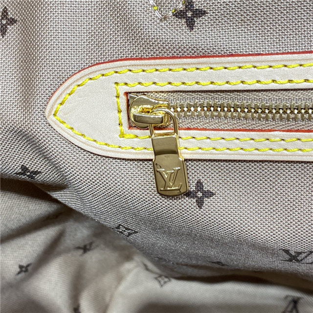 The classic lines of the Neverfull MM tote bag take on a vintage feel in colored Monogram canvas with an exterior front pocket. The gold-color hardware – including the pocket’s buckle – and leather trim complement the long, slim handles that slip comfortably over the shoulder or arm. Inside is a removable pouch that be carried as a clutch.