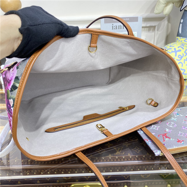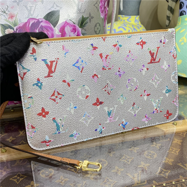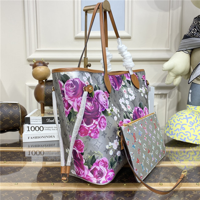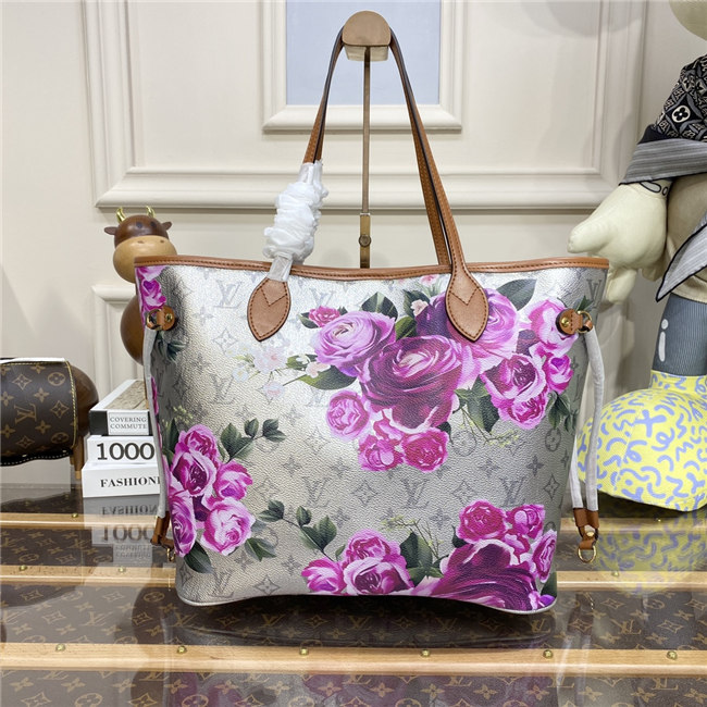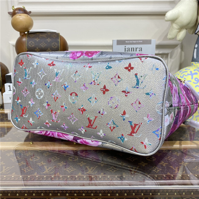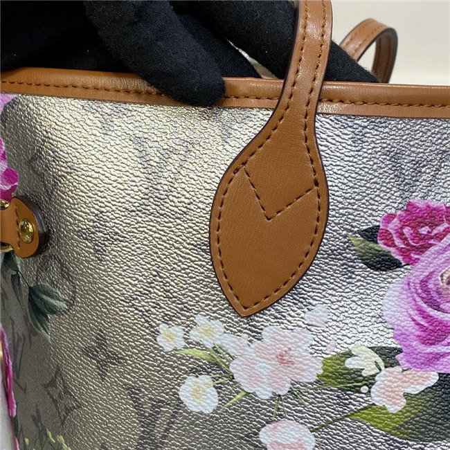 This Neverfull MM tote bag is part of the LV Garden capsule seen at the Fall-Winter 2022 show. The metallic-silver canvas is decorated with a gorgeous all-over flower pattern, inspired by real buttercups bouquets. The side laces cinch for a sleek allure or can be loosened for a more casual feel.